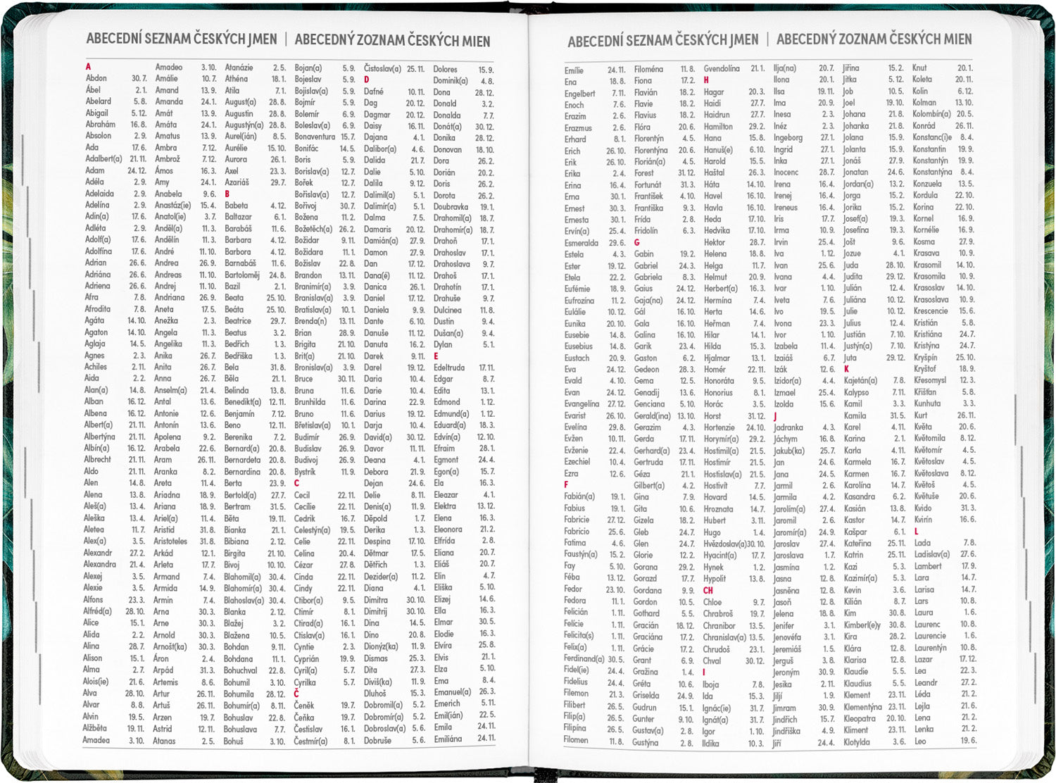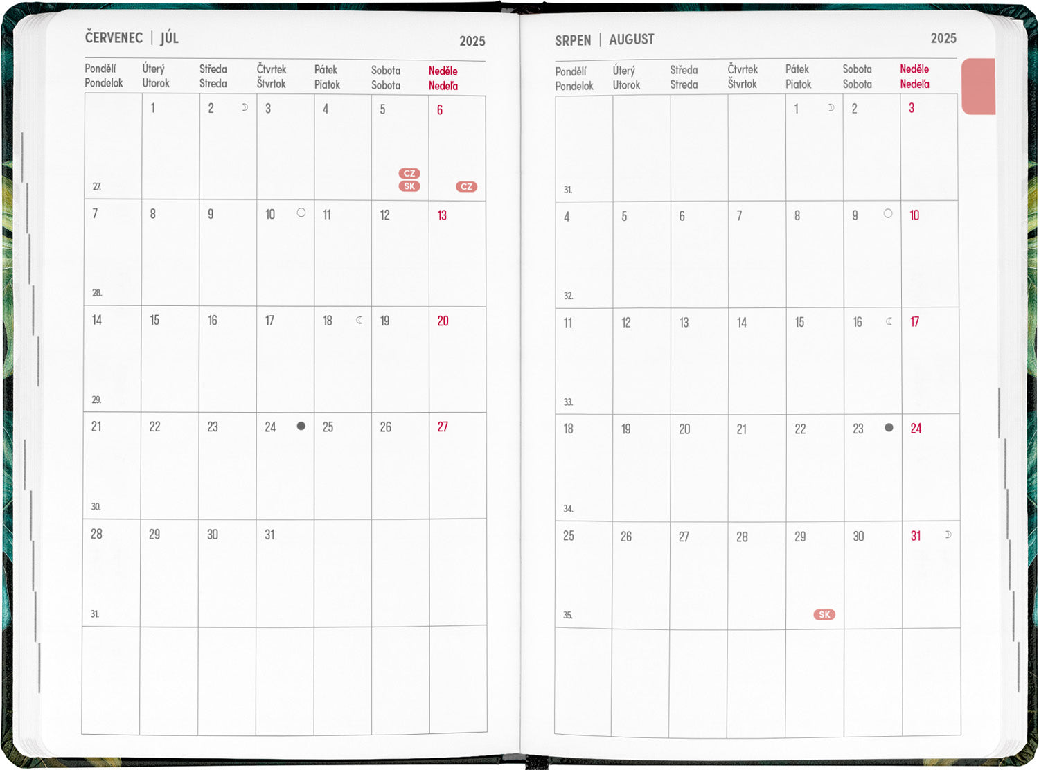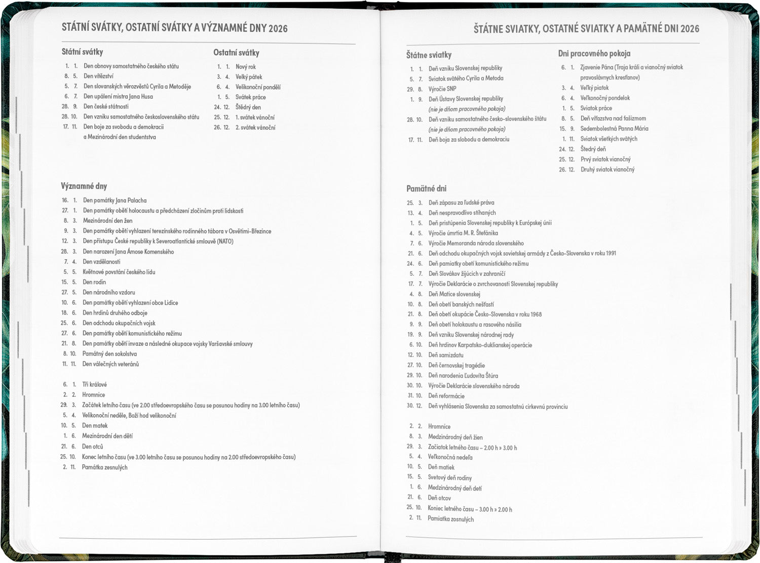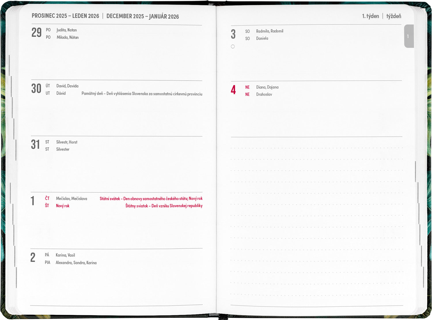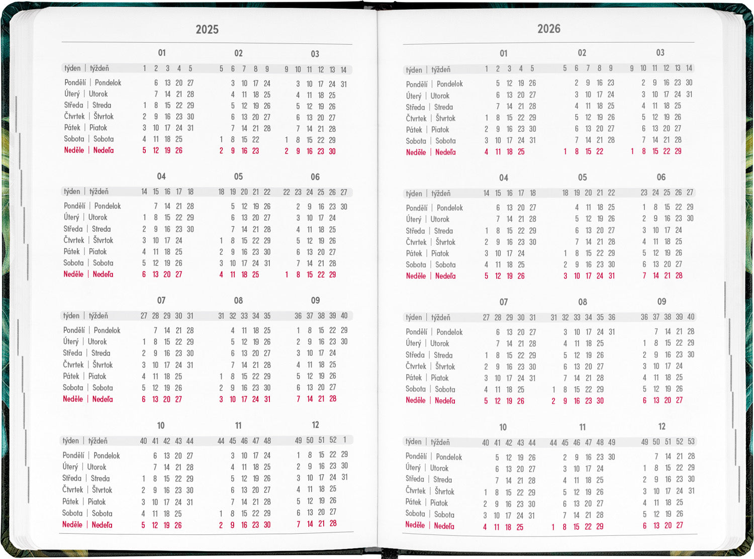 Osmnáctiměsíční diář obsahuje přehled na rok 2025 a 2026, seznam českých a slovenských jmen, česko-slovenské týdenní řádkové kalendárium se jmény a svátky a prostor na poznámky. Kalendárium začíná v červenci 2025 a končí v prosinci 2026.