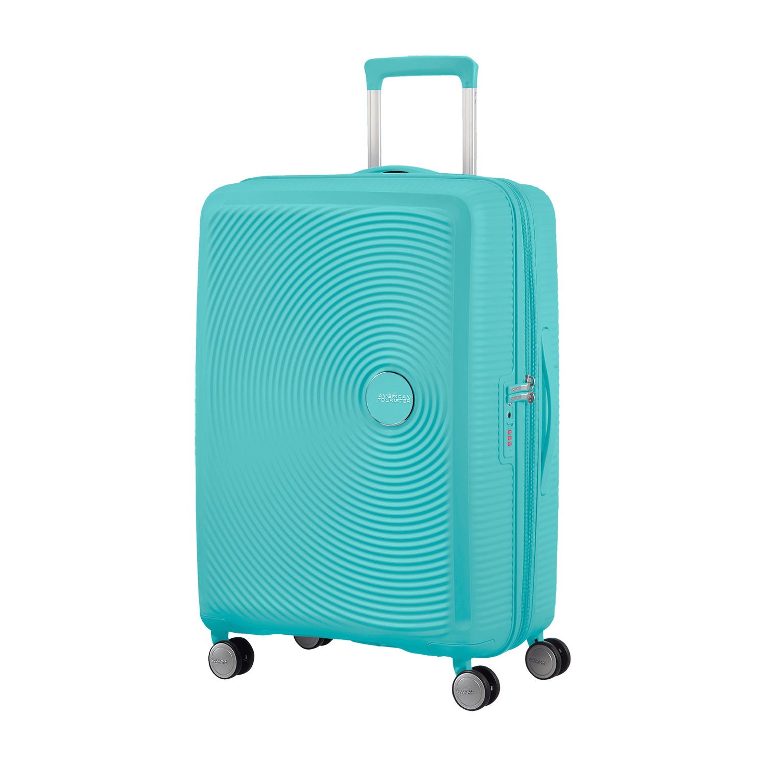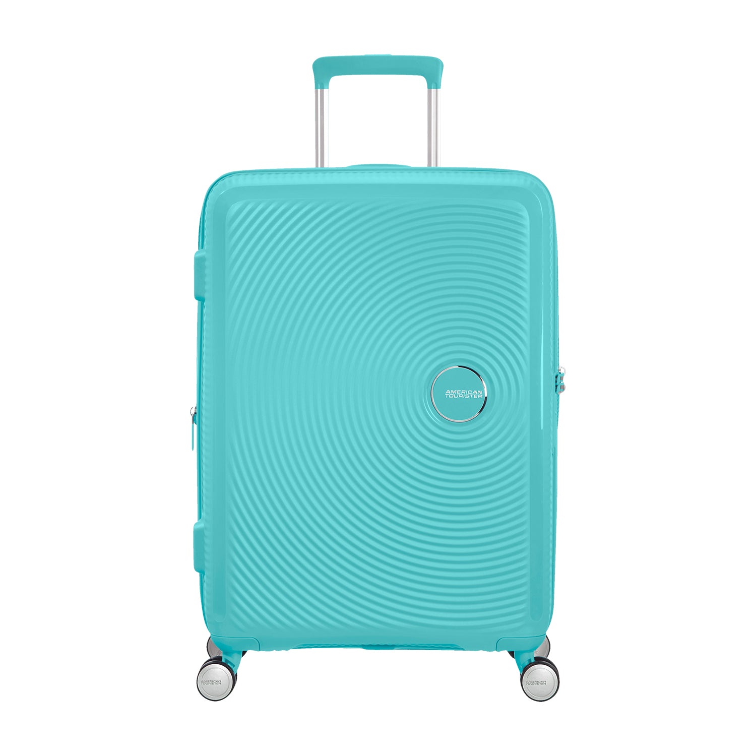 Tyrkysový středně velký kufr s dvojitými kolečky pro snadnou a plynulou jízdu.