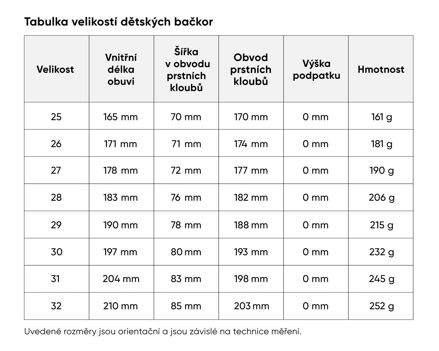 | Velikost | Vnitřní délka obuvi | Šířka v obvodu prstních kloubů | Hmotnost |