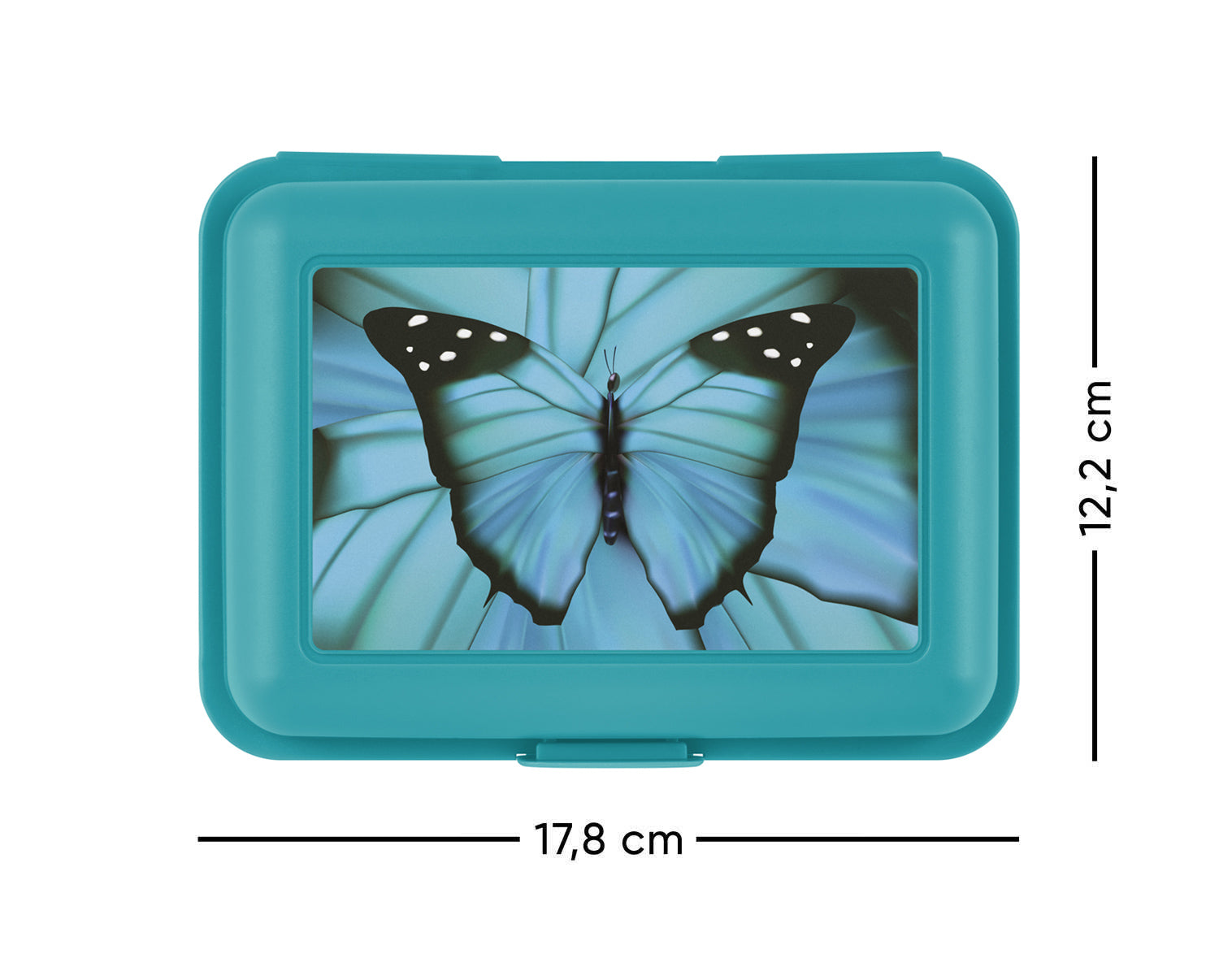 Stylový design tyrkysového motýlka na svačinovém boxu potěší všechny malé i větší slečny a školačky.
