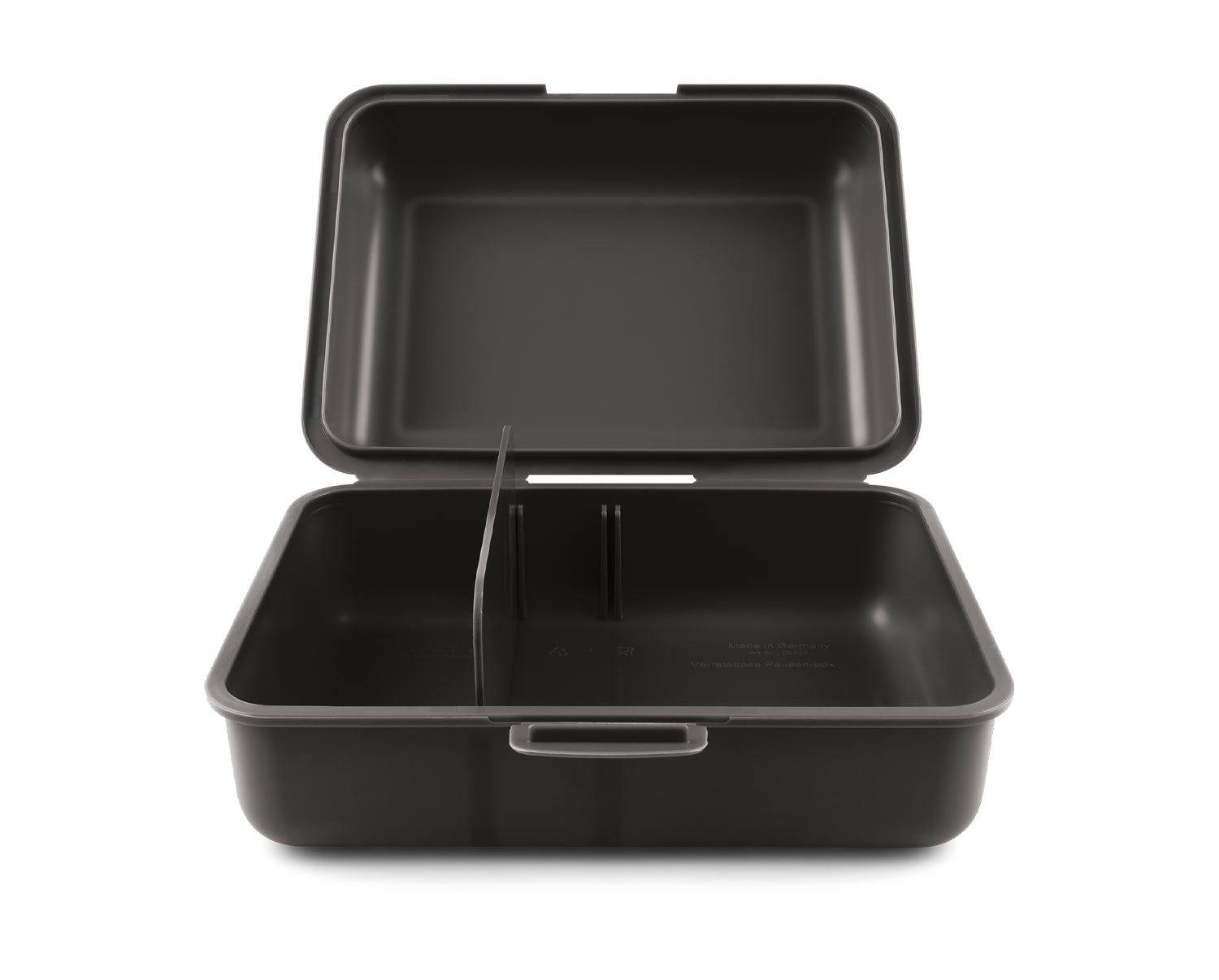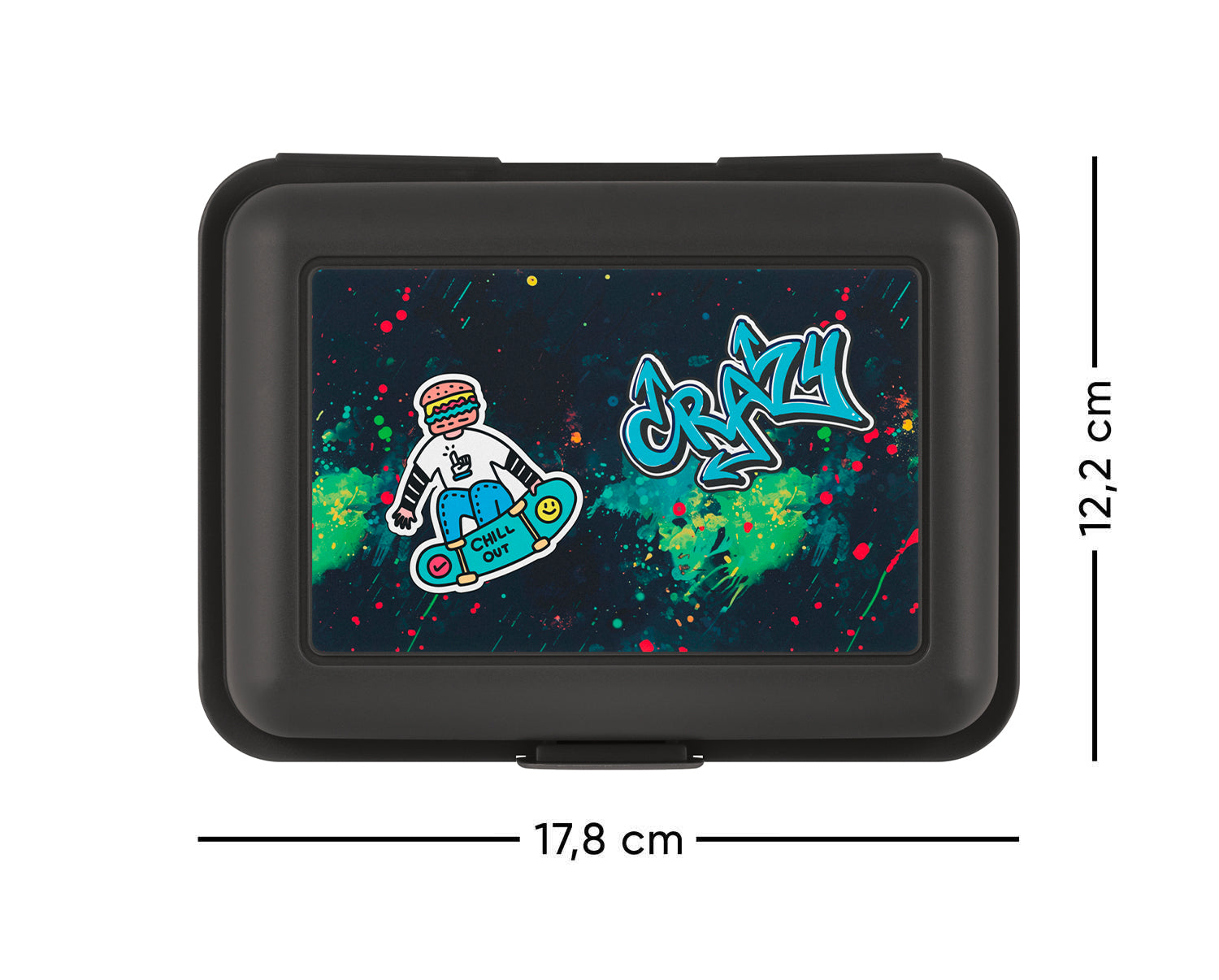 Plastový box na svačinu se skejťáckým motivem a polohovatelnou přepážkou pro snadné oddělení potravin.