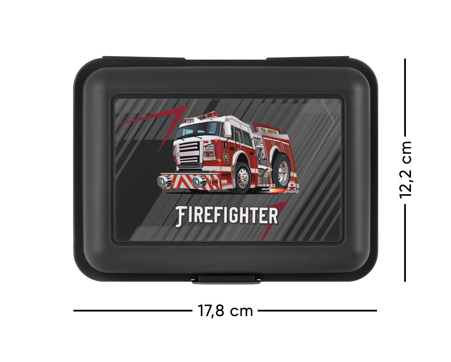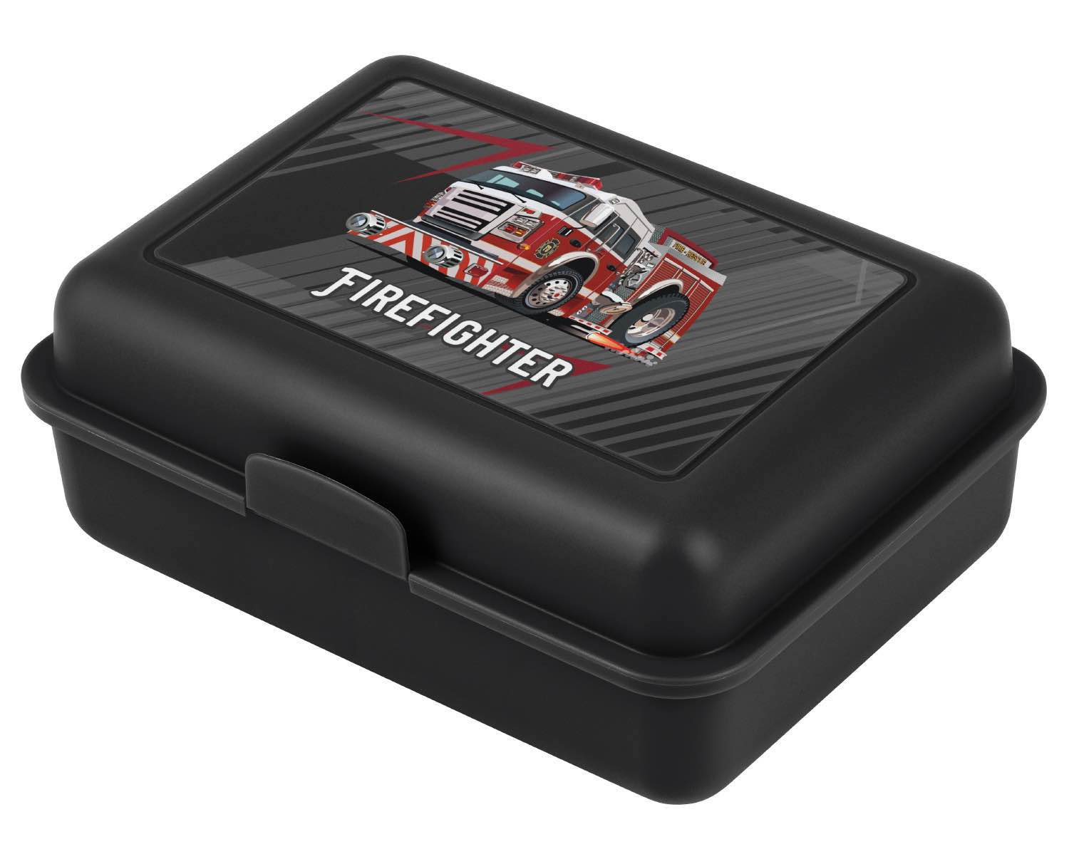 Černý plastový box na svačinu v černé barvě s obrázkem hasičského vozu.