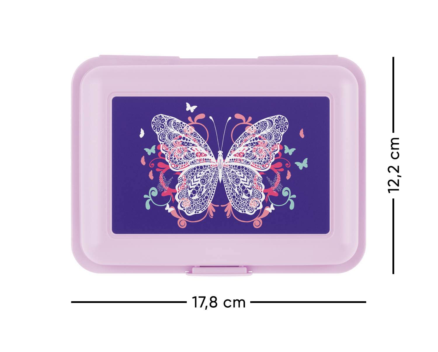 Holčičí plastový box na svačinu ve fialové barvě s obrázkem motýla.