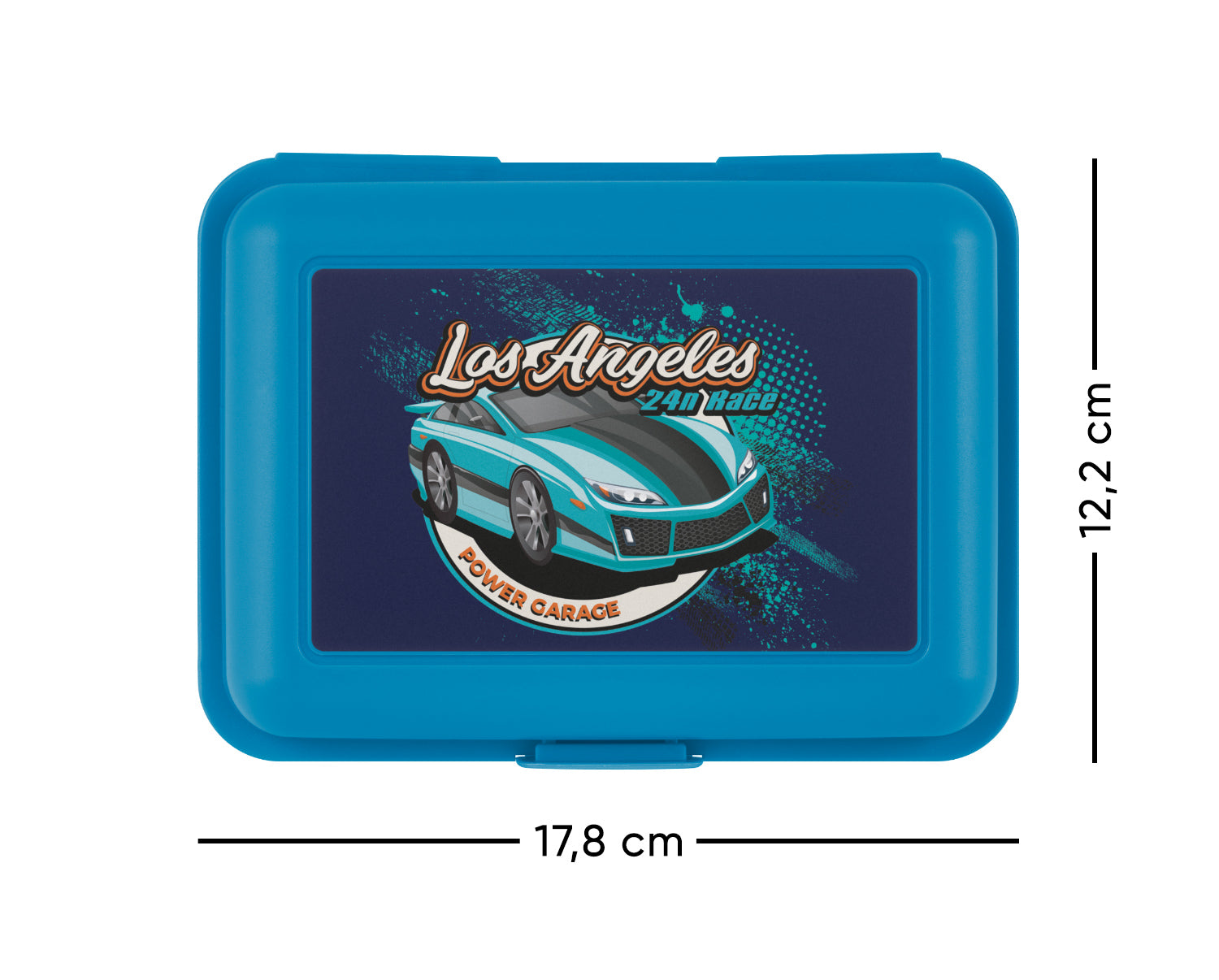 Plastový box na svačinu v modré barvě s obrázkem závodního auta.