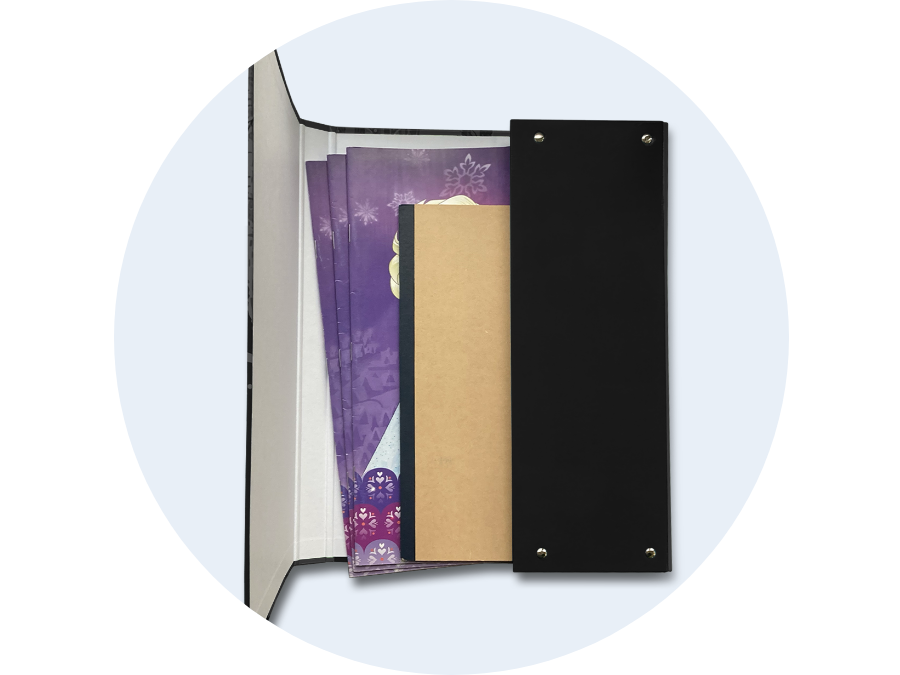 • Ochranné desky na úschovu sešitů či jiných dokumentů, včetně vnitřní klopy proti vypadnutí, zajištěné gumičkou.