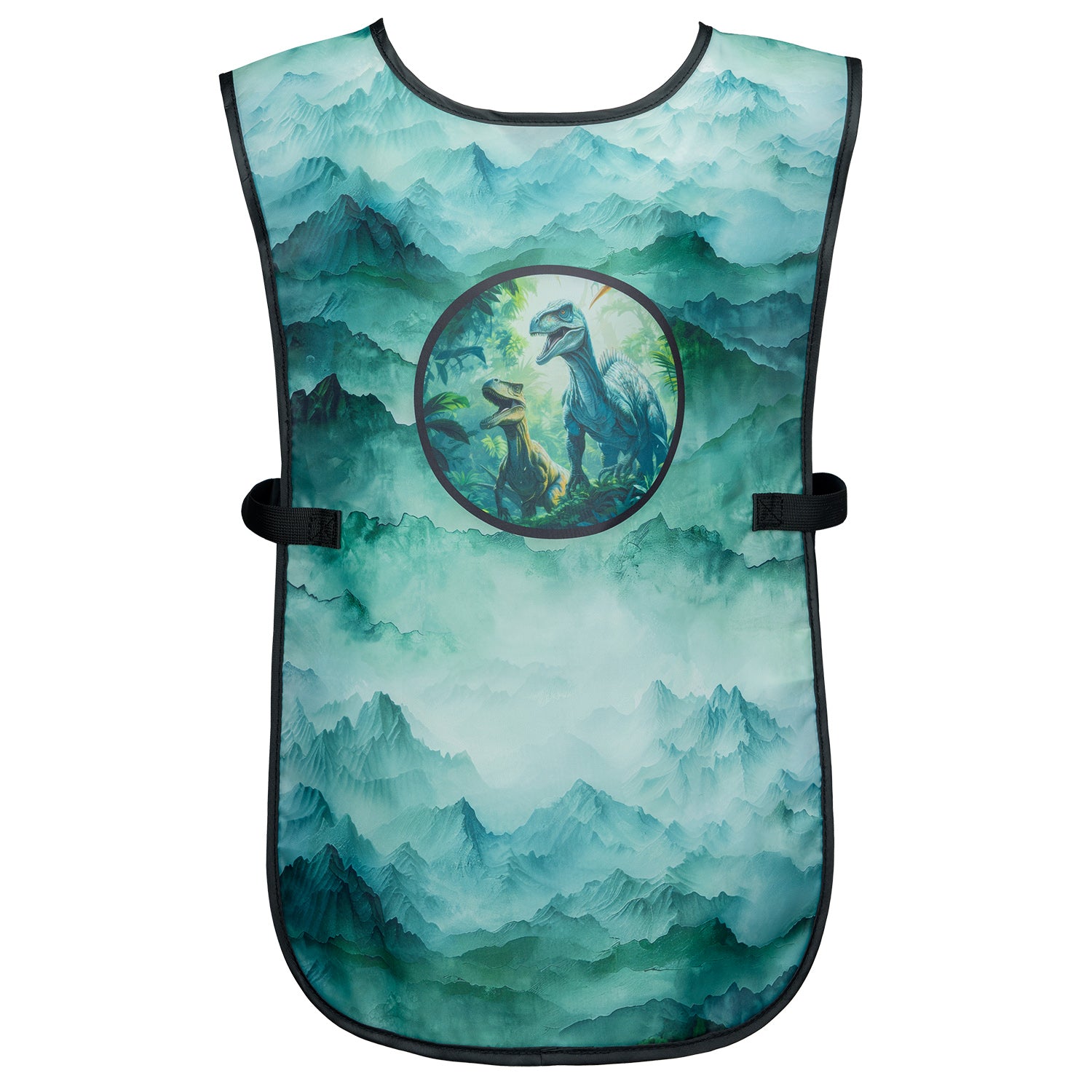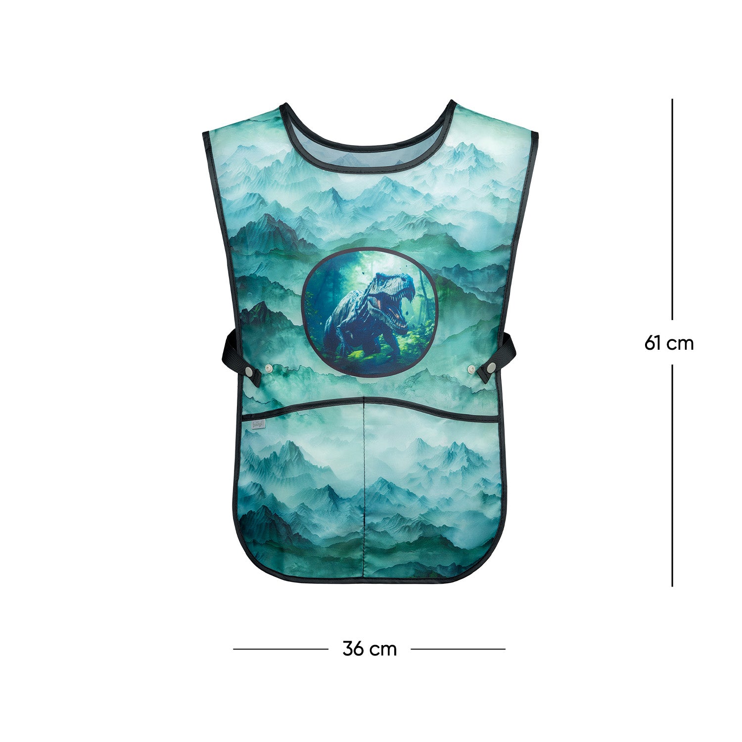 Dětská zástěra na výtvarnou výchovu s motivem druhohor a tyranosaura zajistí nejen čisté oblečení při tvorbě veledíla vašeho školáka, ale také klid vaší duši.