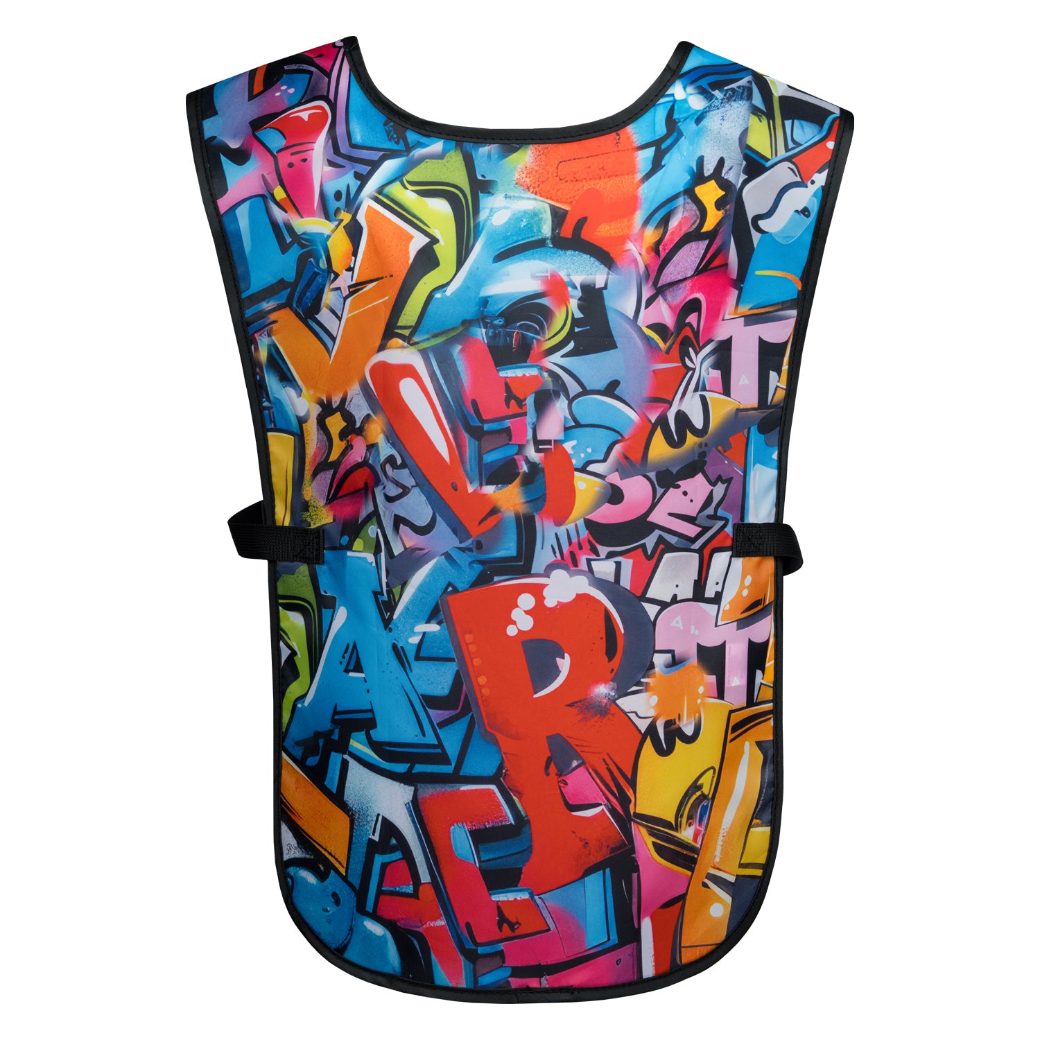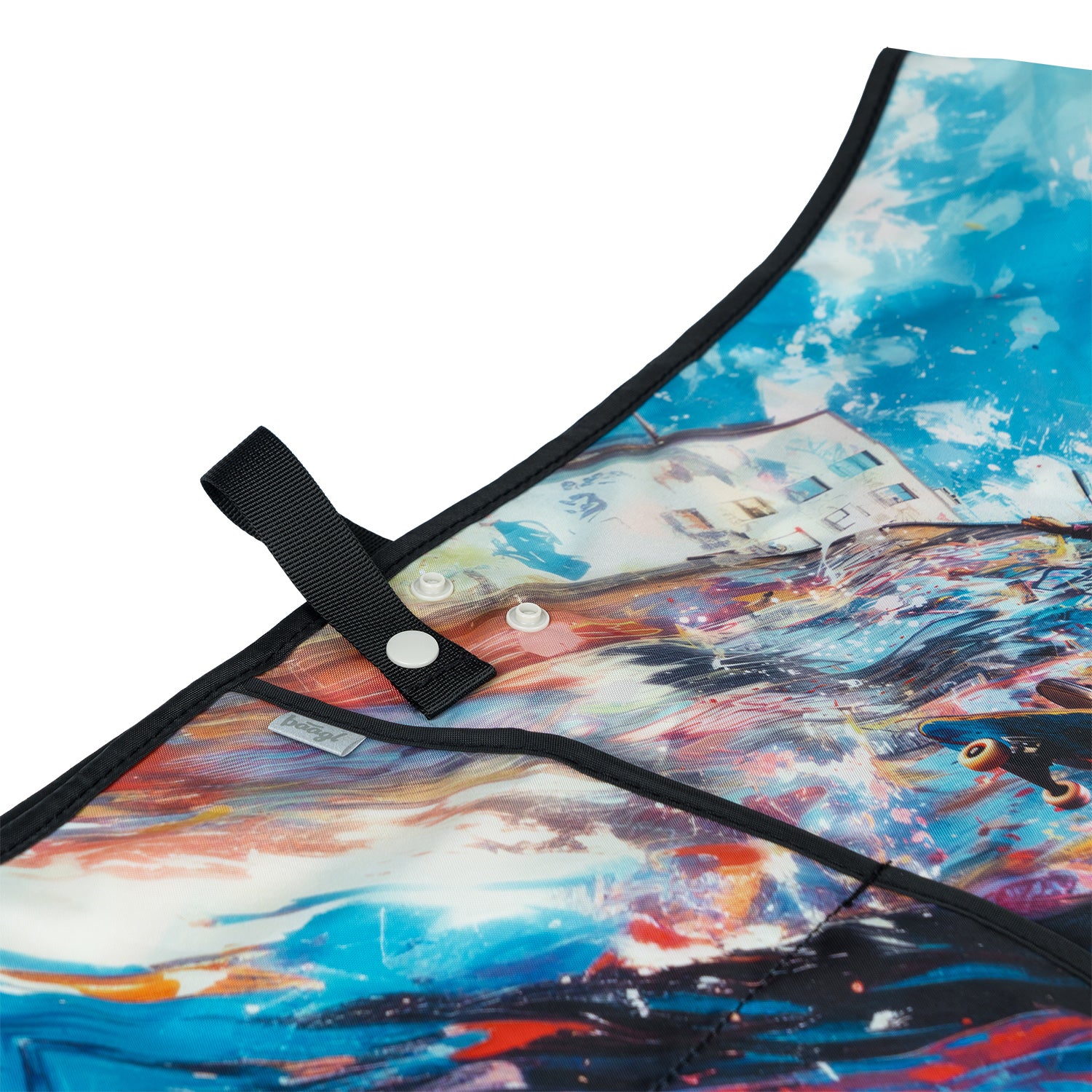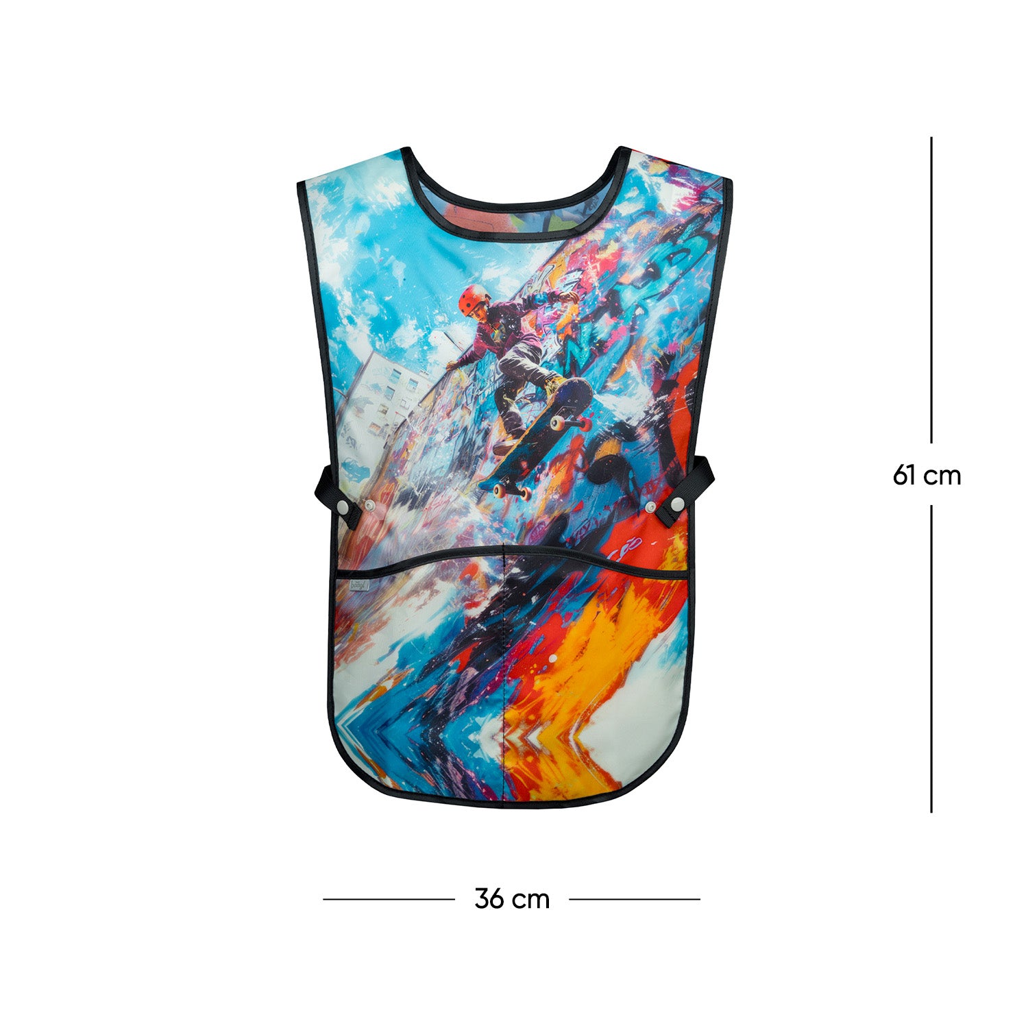 Stylová zástěra s motivem skateparku, vhodná na výtvarnou výchovu, pracovní činnosti a různé kroužky.