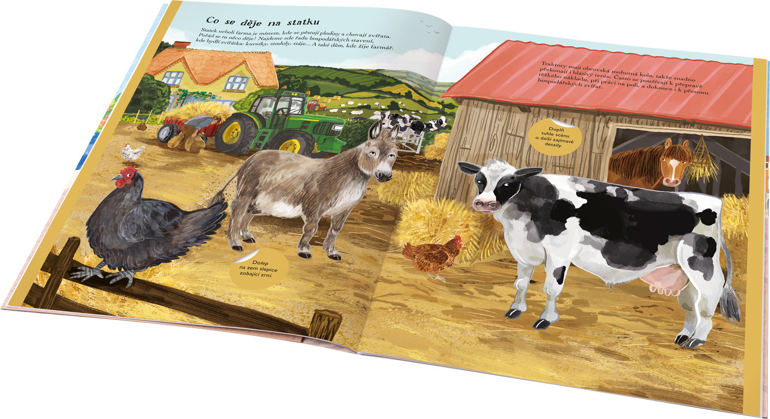 Vydejte se na dobrodružnou výpravu za zvířaty, kterým říkáme hospodářská – to jsou ta, která lidé už po tisíce let chovají pro nějaký užitek. Na farmě jich najdete mnoho a mnoho druhů! Liší se nejen podobou, ale také velikostí a nám lidem slouží různým způsobem. S knížkou plnou samolepek navštívíte stáj, kurník, výběh, pole, luka, sad i rybník – všude tam najdete hospodářská zvířátka, ale i celou řadu dalších tvorečků, kteří jim dělají společnost. V téhle knížce se o nich dozvíte mnoho zajímavostí, a navíc si užijete spoustu zábavy při dotváření 11 překrásných scenerií za pomoci roztomilých samolepek. Tak už na nic nečekejte a pusťte se do nalepování!