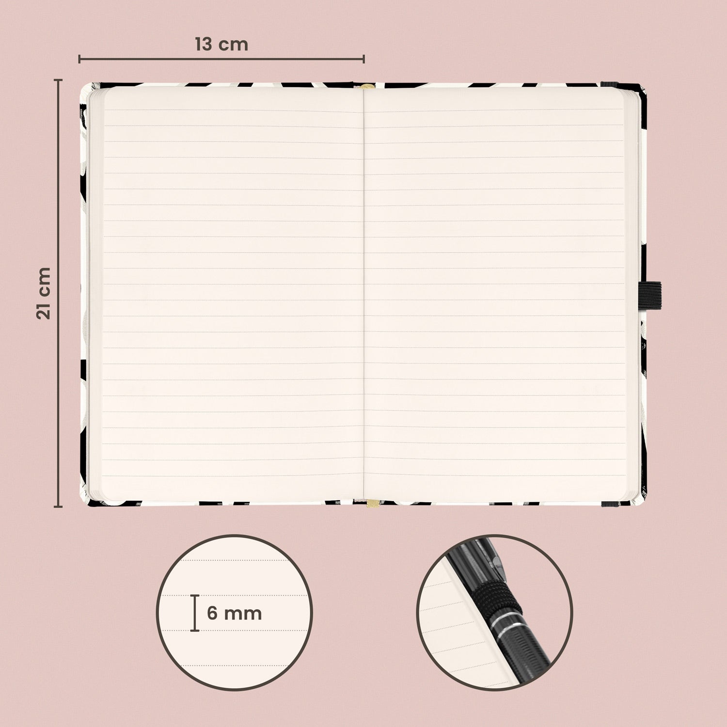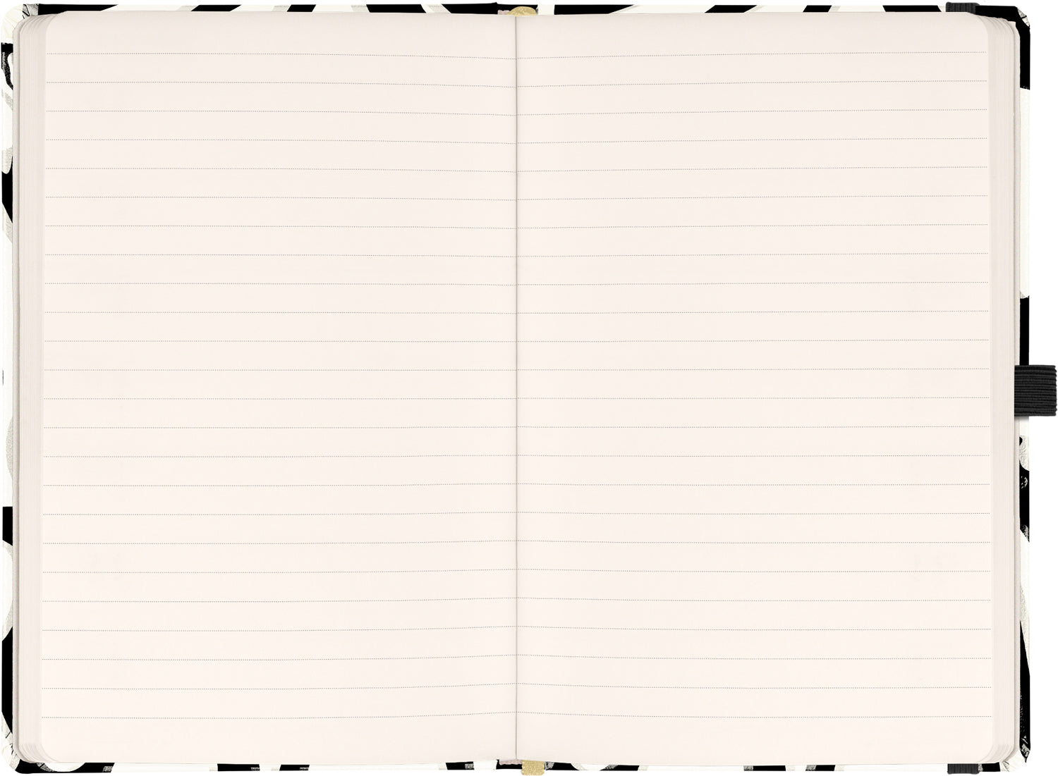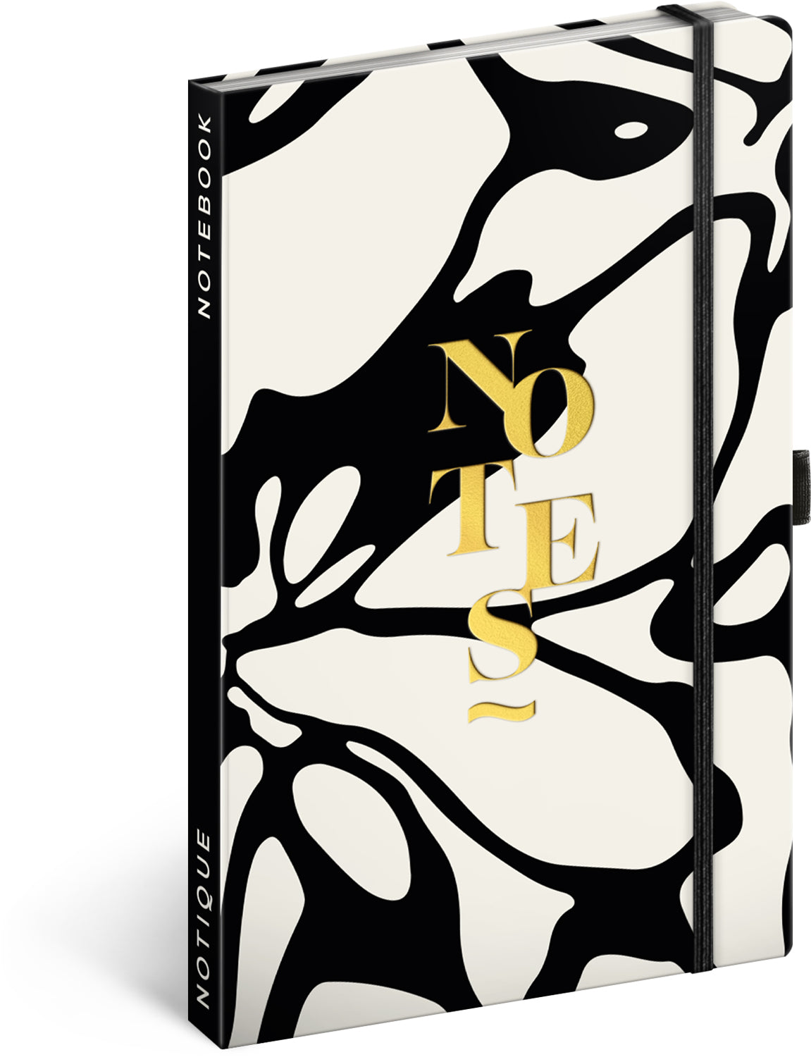 Linkovaný notes v tvrdých deskách se zavíráním na gumičku a s abstraktním černo-bílým motivem.