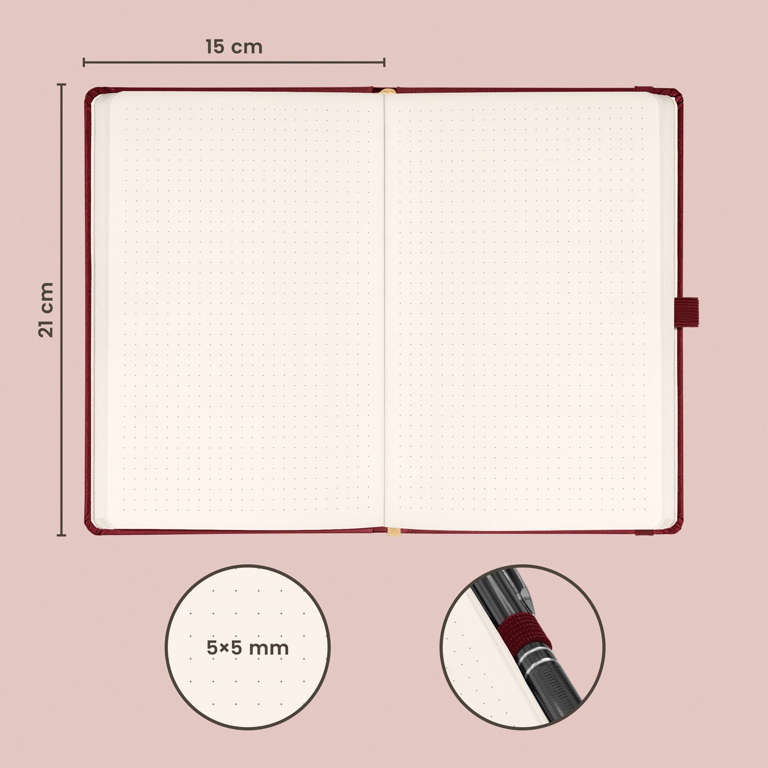 Klasický tečkovaný notes v barvě bordó, oblíbený díky kvalitnímu svrchnímu materiálu.