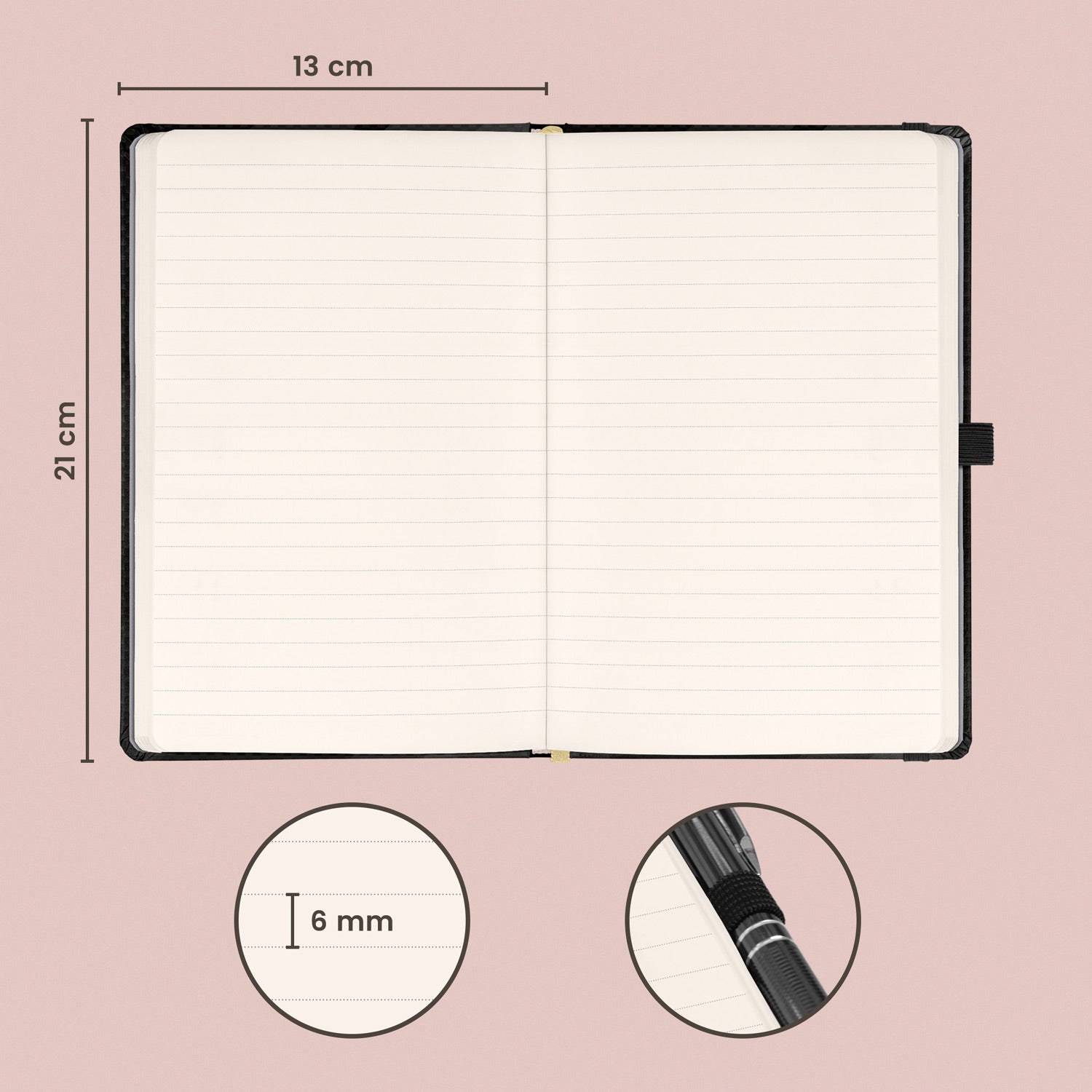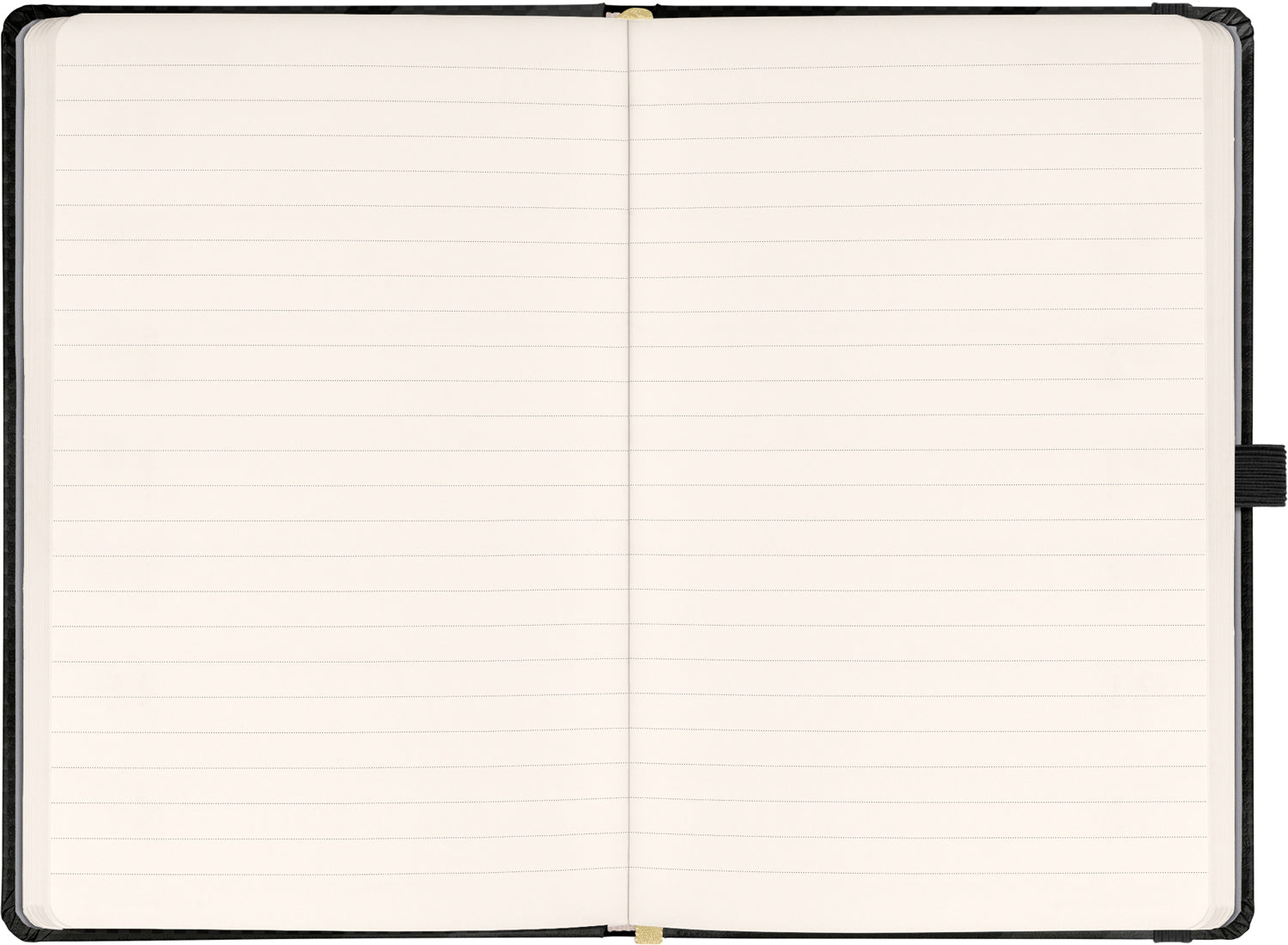 Linkovaný notes v tvrdých deskách se zavíráním na gumičku a v elegantním černém designu.