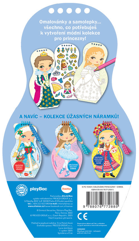 Knížka z jedné z našich nejoblíbenějších sérií obsahuje kreativní omalovánky a spoustu samolepek… jednoduše vše, co je třeba k vytvoření nesčetných modelů pro princezny. A k tomu se v ní dočtete spoustu zajímavých informací! Jak to vypadalo na jednom z nejpřepychovějších královských dvorů všech dob – na dvoře Ludvíka XIV. zvaného Král Slunce? Jak se oblékaly urozené dámy a v jakých komnatách přebývaly? To a ještě mnohem víc se dozvíte, vydáte-li se za poznáním s naší panenkou, princeznou Emmou. Ke každé knížce dostanete navíc krásný náramek.