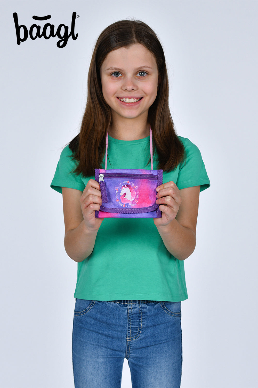 Fialová peněženka s motivem koně a šňůrkou s bezpečnostní pojistkou pro pohodlné a bezpečné nošení na krku.