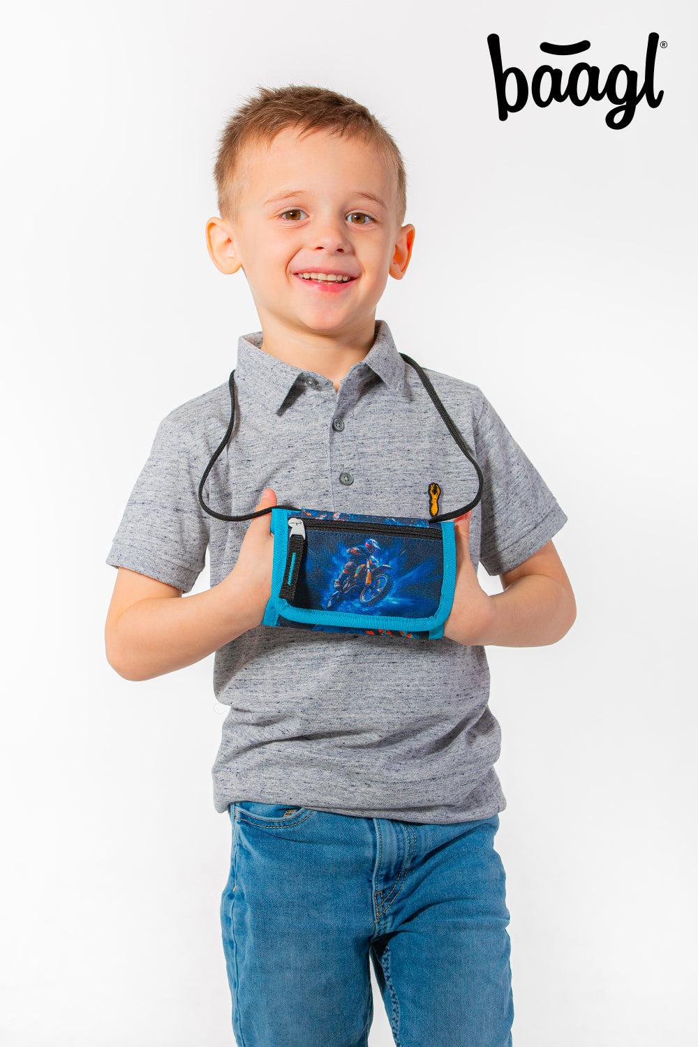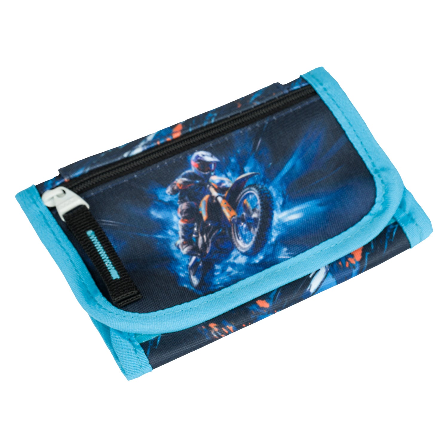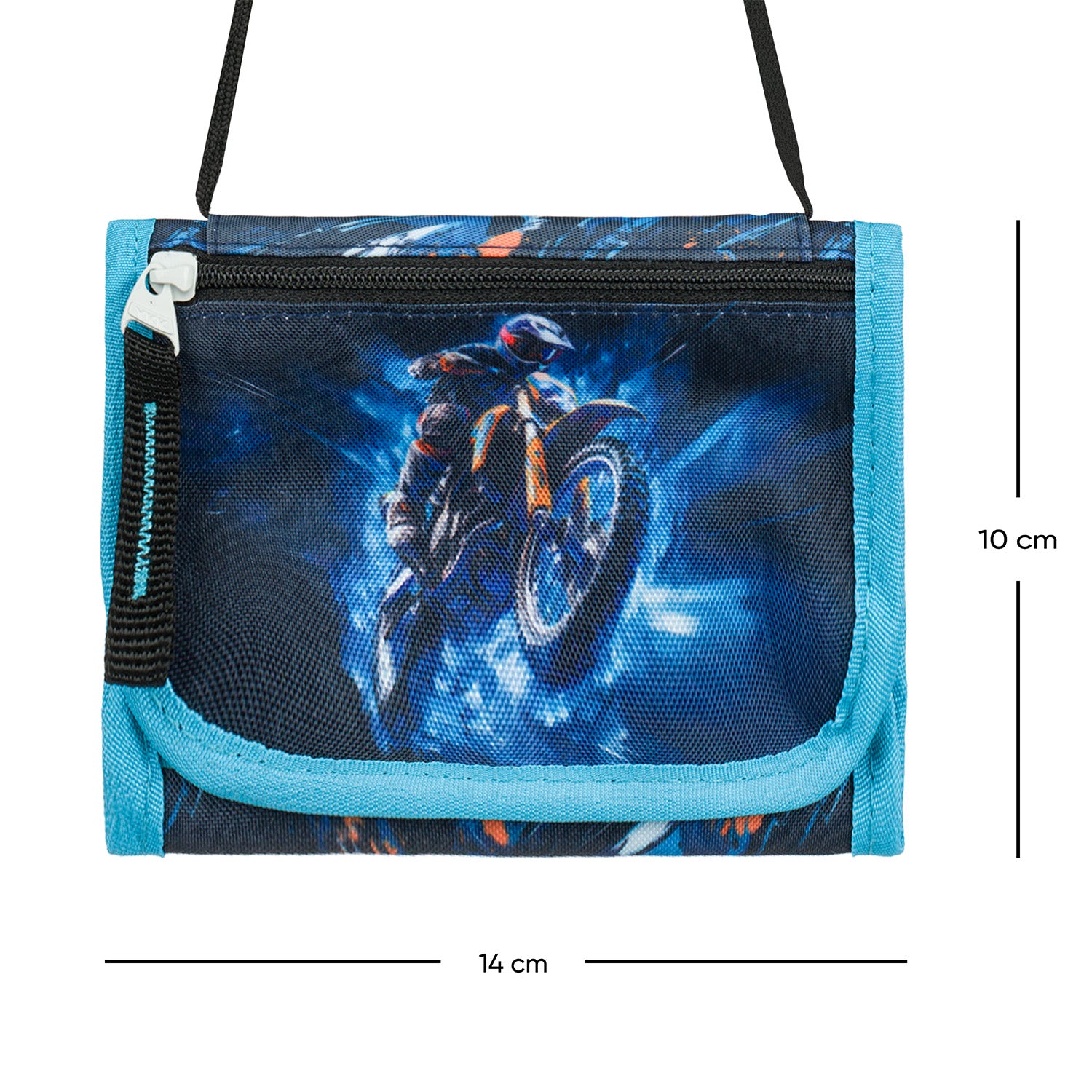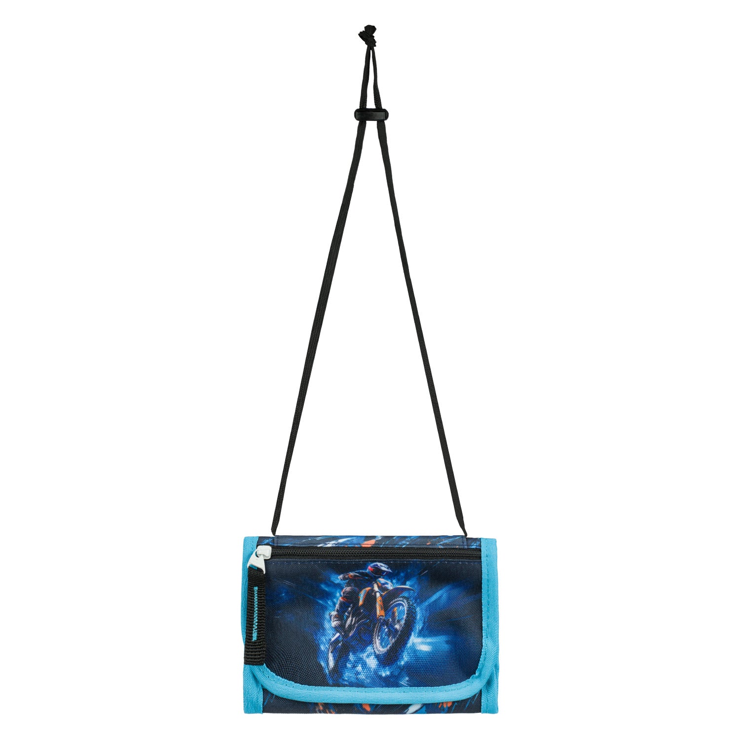 Šikovná peněženka na suchý zip s motivem motorky. Nechybí nastavitelná šňůrka s pojistkou pro zavěšení na krk ani kapsička na drobné.
