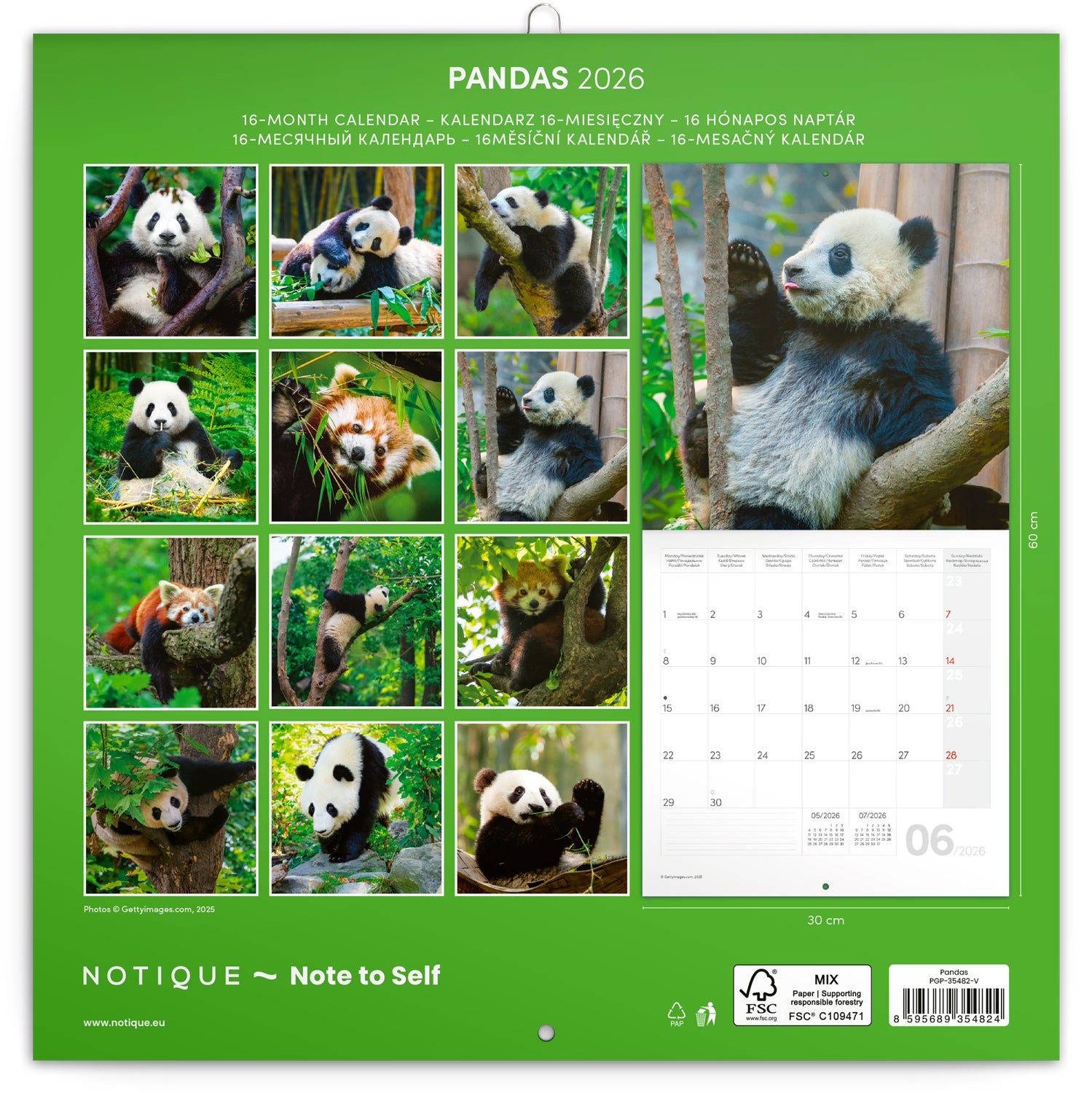 Fotografie huňatých a nemotorných pand na stránkách poznámkového kalendáře vám vykouzlí úsměv na rtech. Uvnitř najdete přehledné kalendárium od září 2025 do prosince 2026 v šesti jazycích, měsíční fáze, důležité svátky a prostor pro poznámky na každý den.