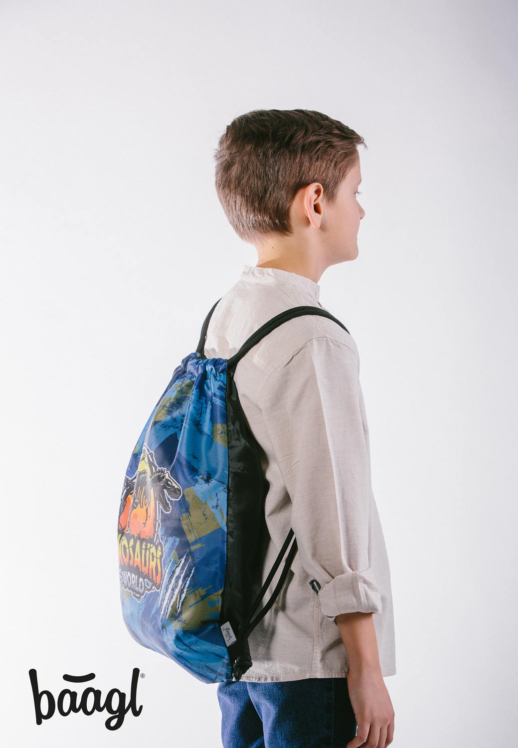 Školní sáček na cvičky s nesmrtelným motivem dinosaura, je vyrobený z pevného voděodolného materiálu a má silné šňůrky pro pohodlné nošení na zádech.
