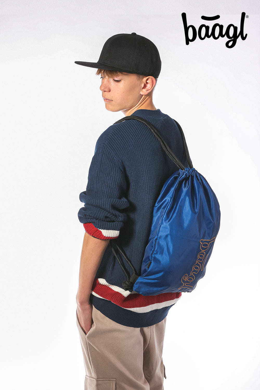 Modrý sáček Duo s logem BAAGL a pevnými tkanicemi je ideální na přezůvky i tělocvik.
