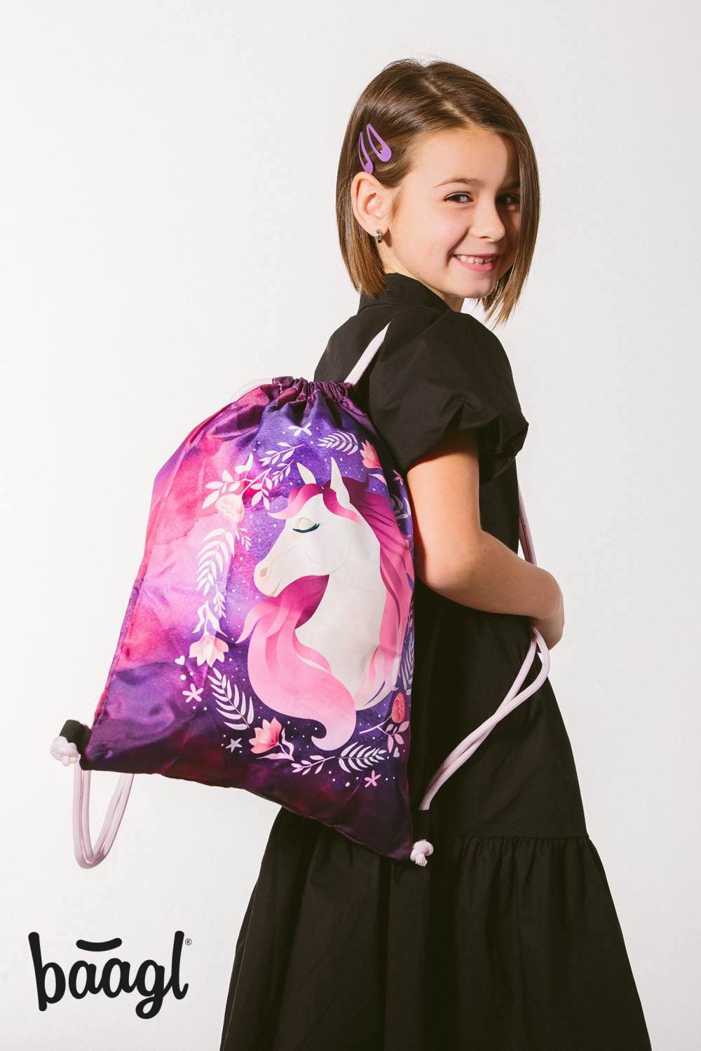 Fialový sáček na obuv nebo na tělocvik Kůň je vyroben z pevného voděodolného materiálu se silnými šňůrami pro pohodlné nošení na zádech.