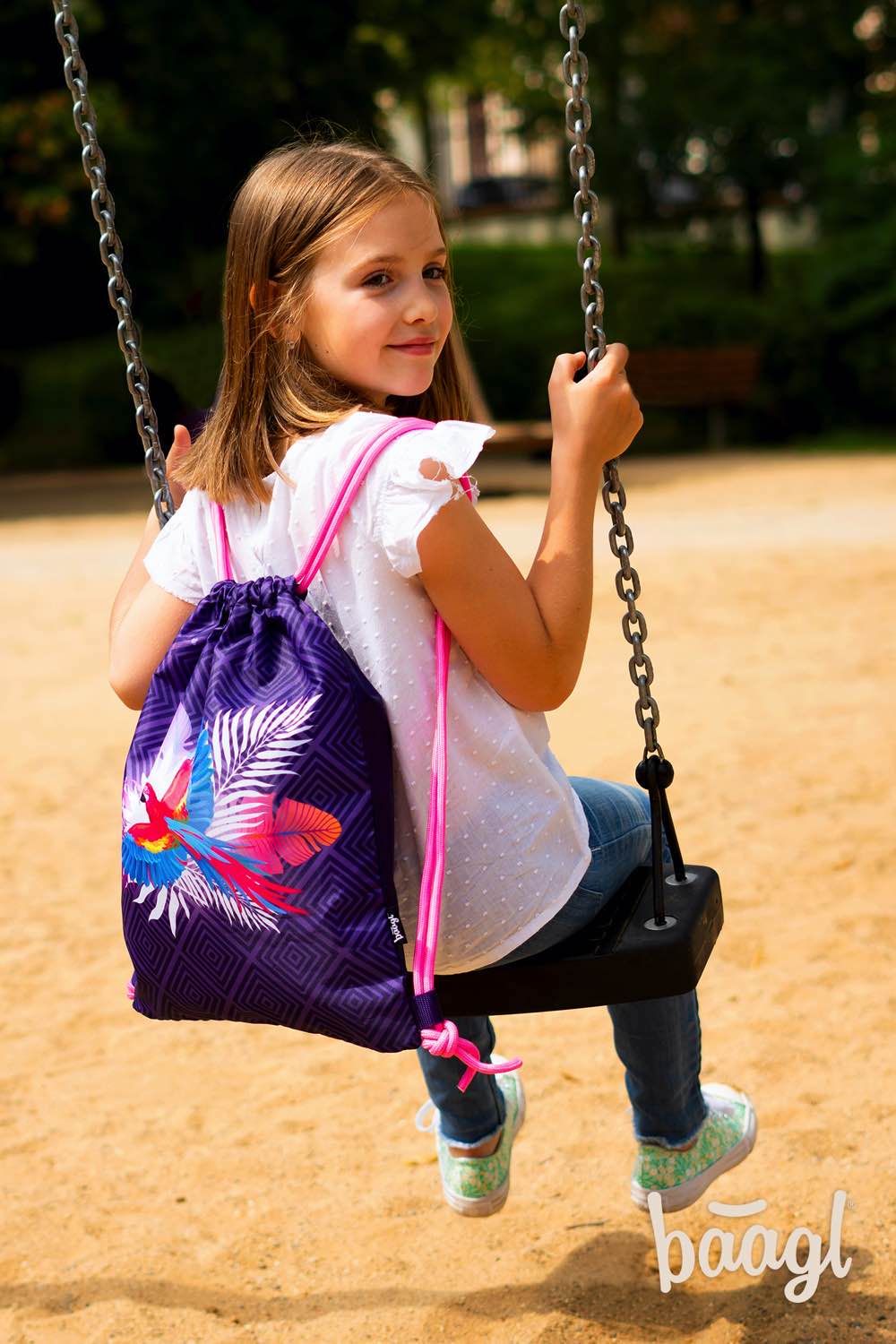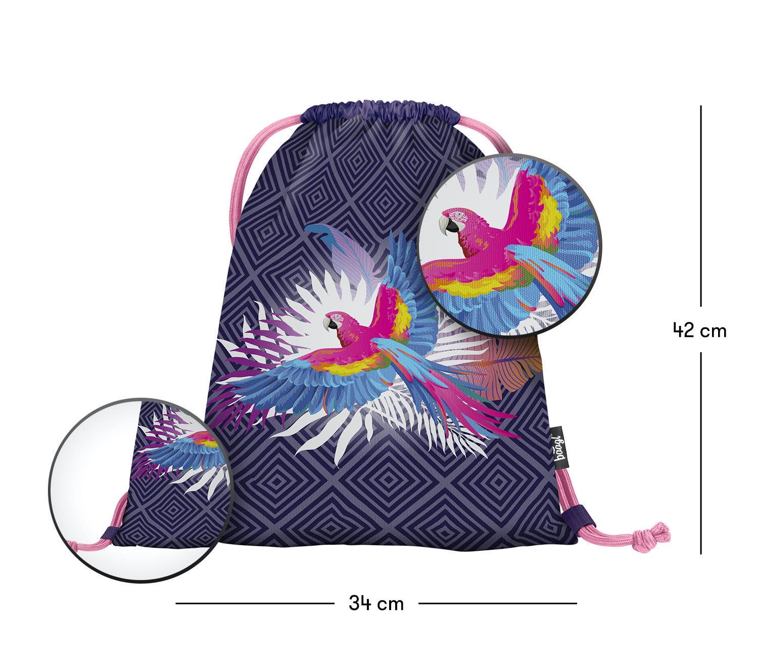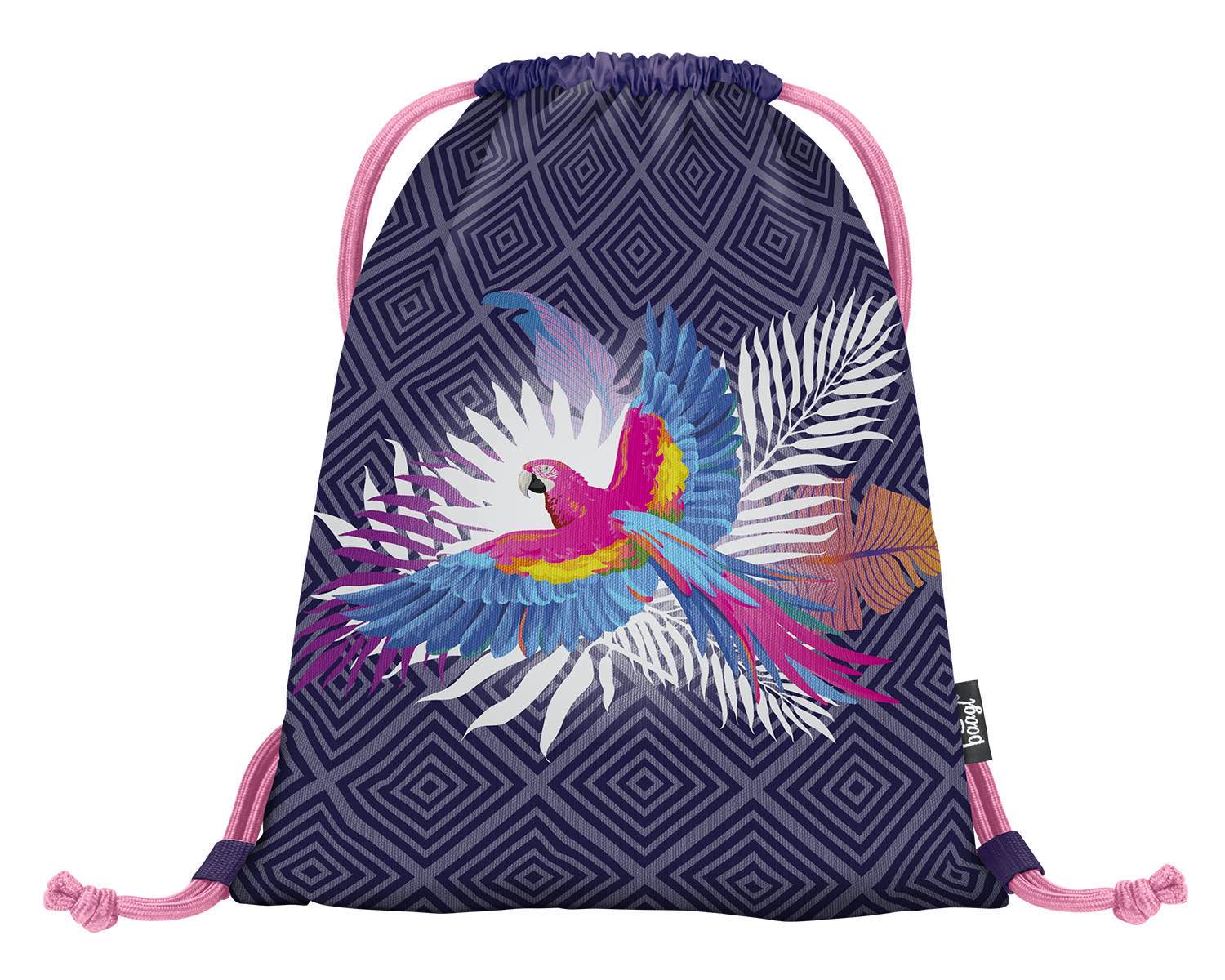Holčičí sáček na cvičky či přezůvky v tmavě fialové barvě s potiskem pestrobarevného papouška.