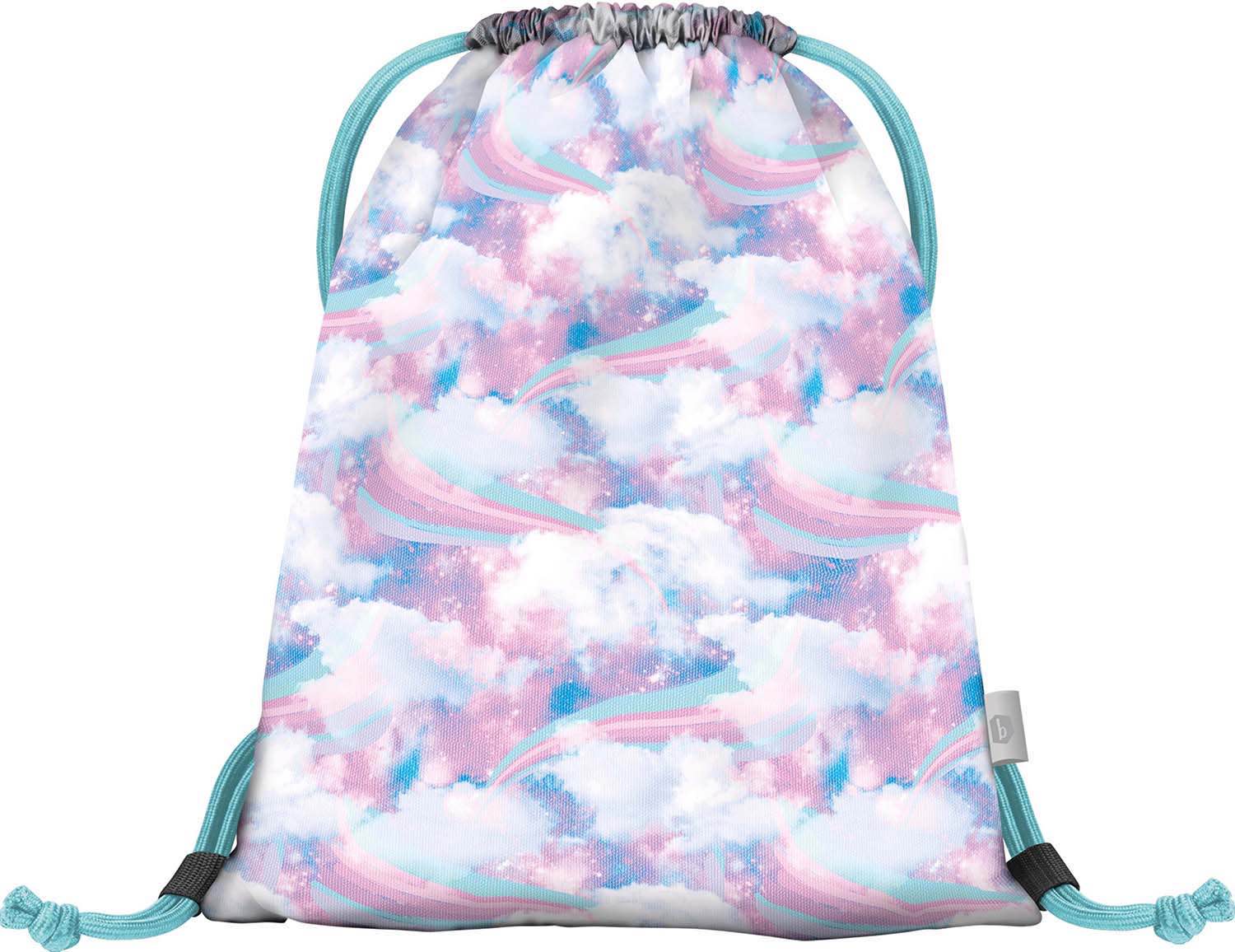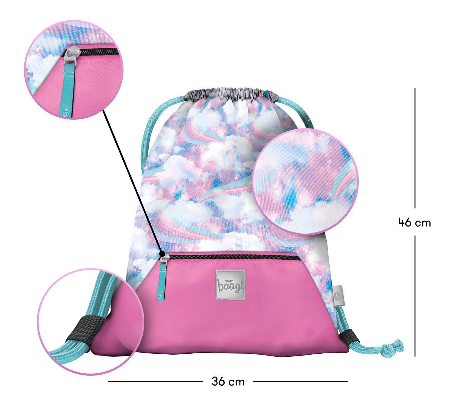 Holčičí sáček na bačkory nebo na tělocvik Nebe je vyroben z pevného voděodolného materiálu. Má zesílené šňůry pro pohodlné nošení na zádech a praktickou kapsičku na zip.