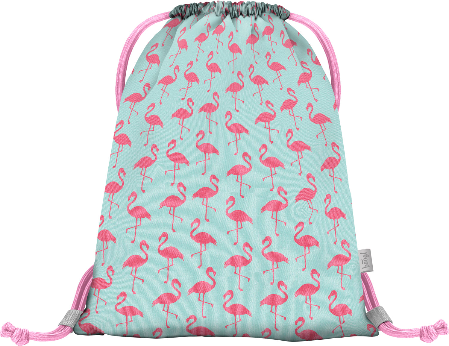 Sáček na tělocvik laděný do mentolově zelené a růžové barvy s potiskem plameňáků a praktickou kapsičkou na přední straně.