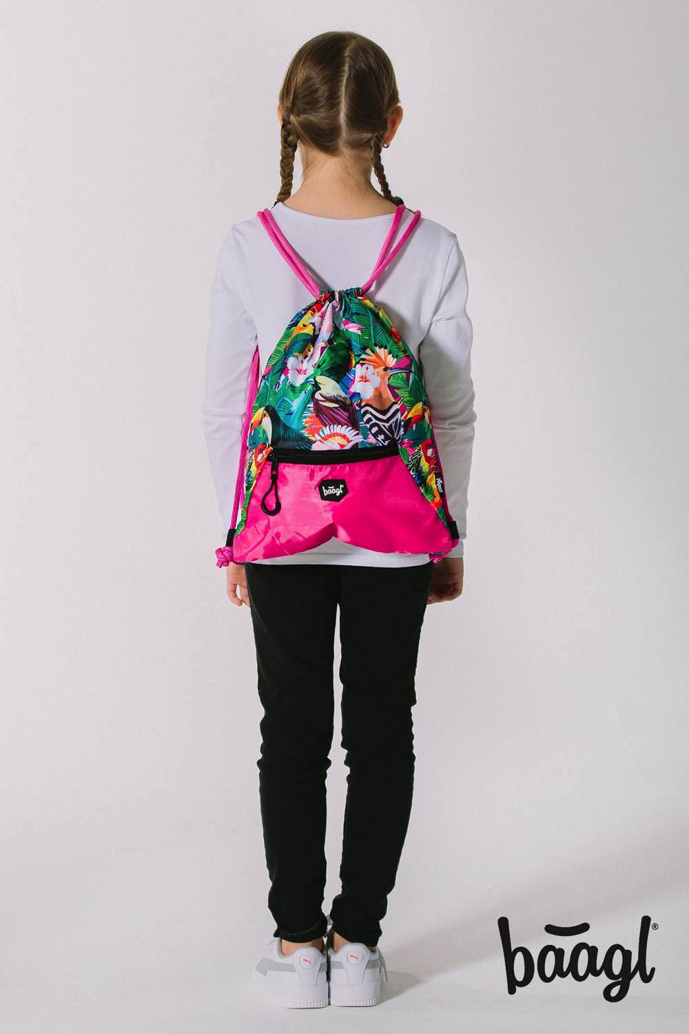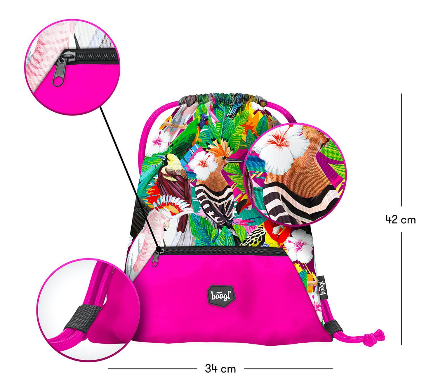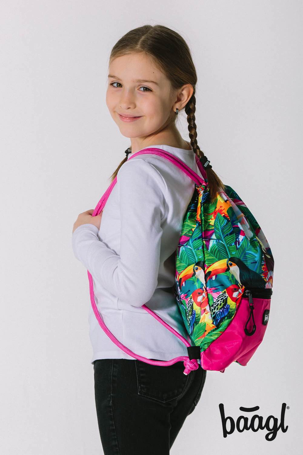 Sáček Tukan s potiskem tropických papoušků a výraznou kapsičkou na zip.