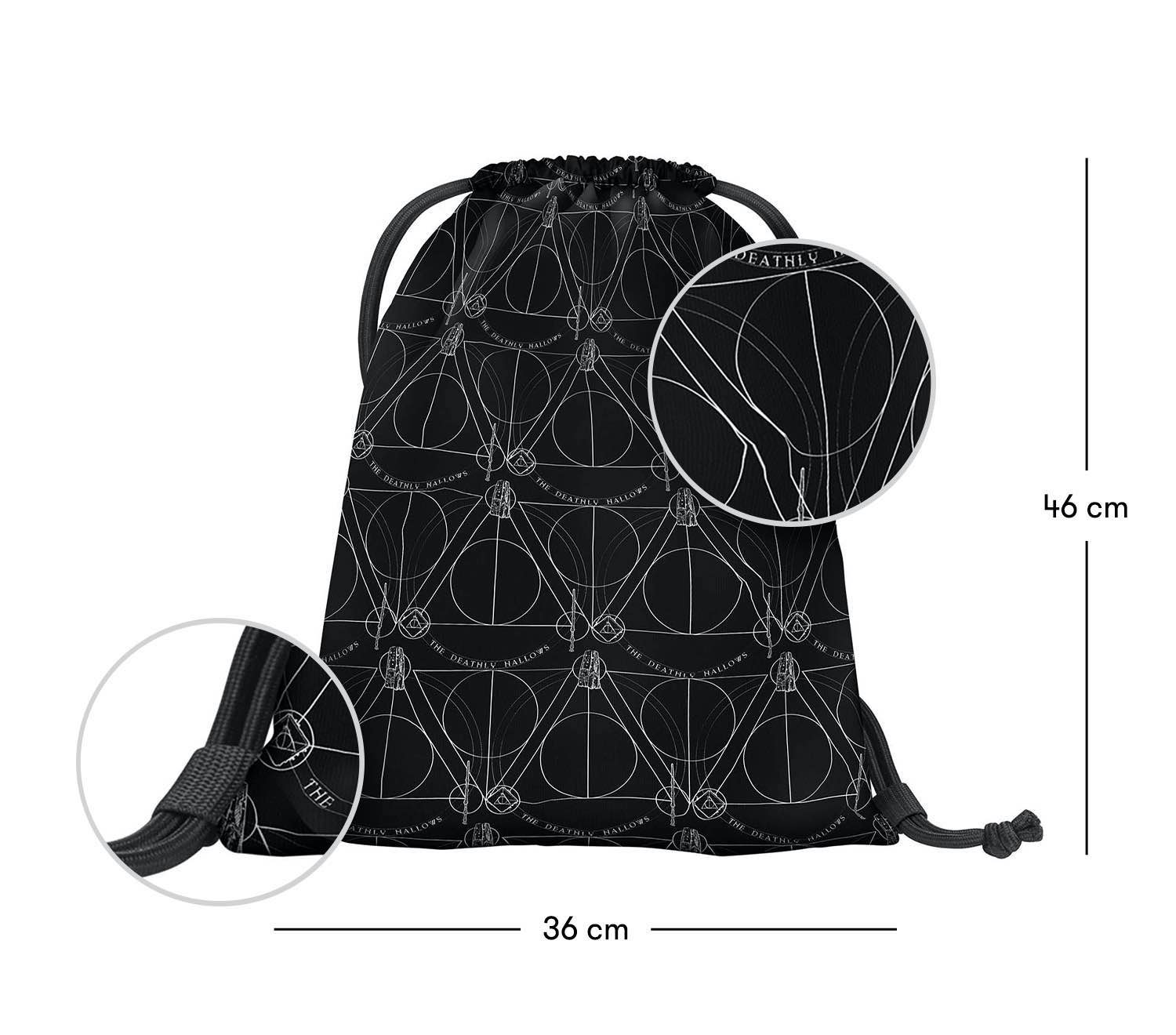 Sáček na obuv nebo potřeby na tělocvik Harry Potter Relikvie smrti je vyroben z pevného voděodolného materiálu se silnými šňůrami pro pohodlné nošení na zádech.