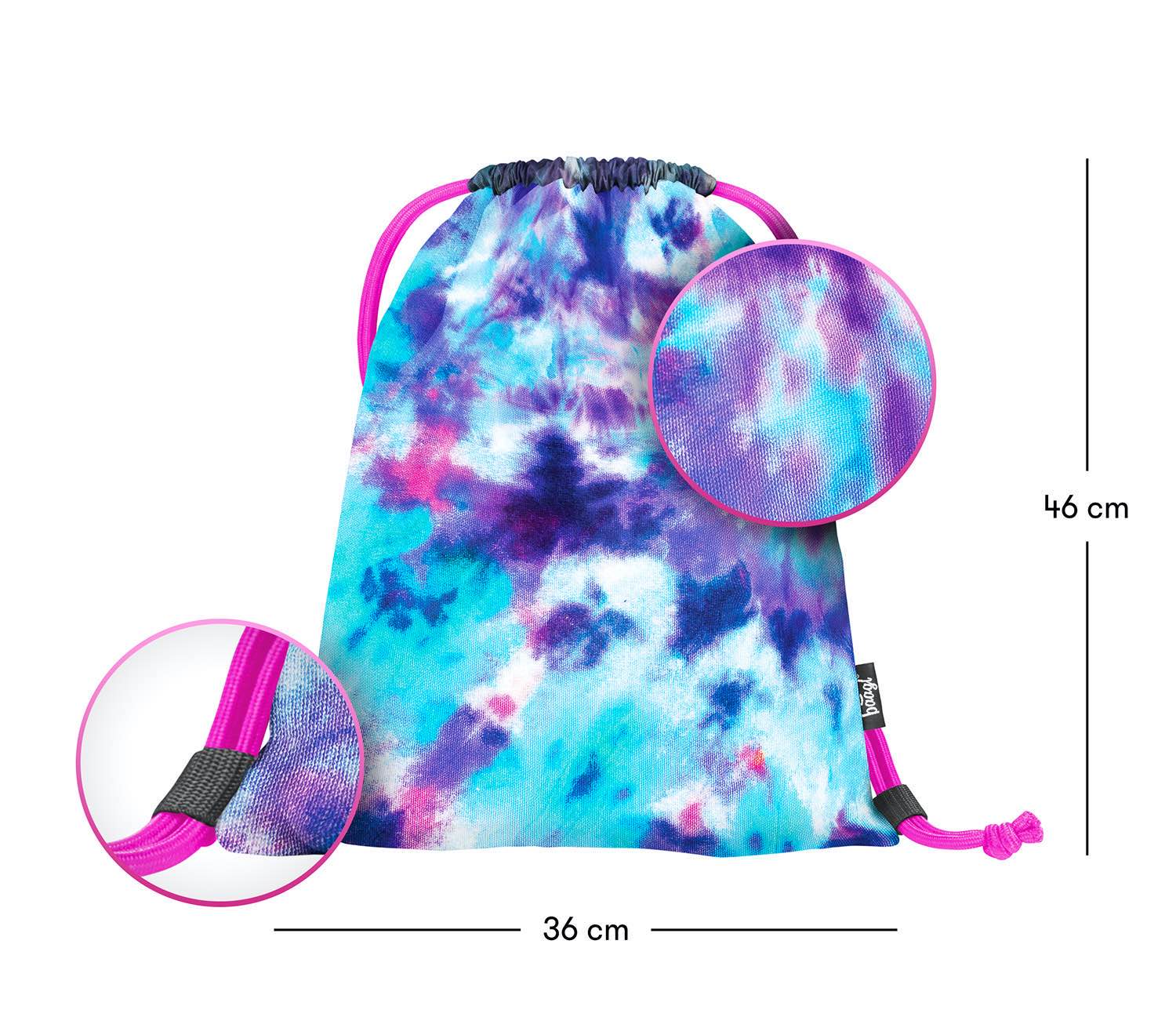 Modrý sáček na obuv s vyýraznými růžovými tkanicemi pro nošení na zádech.