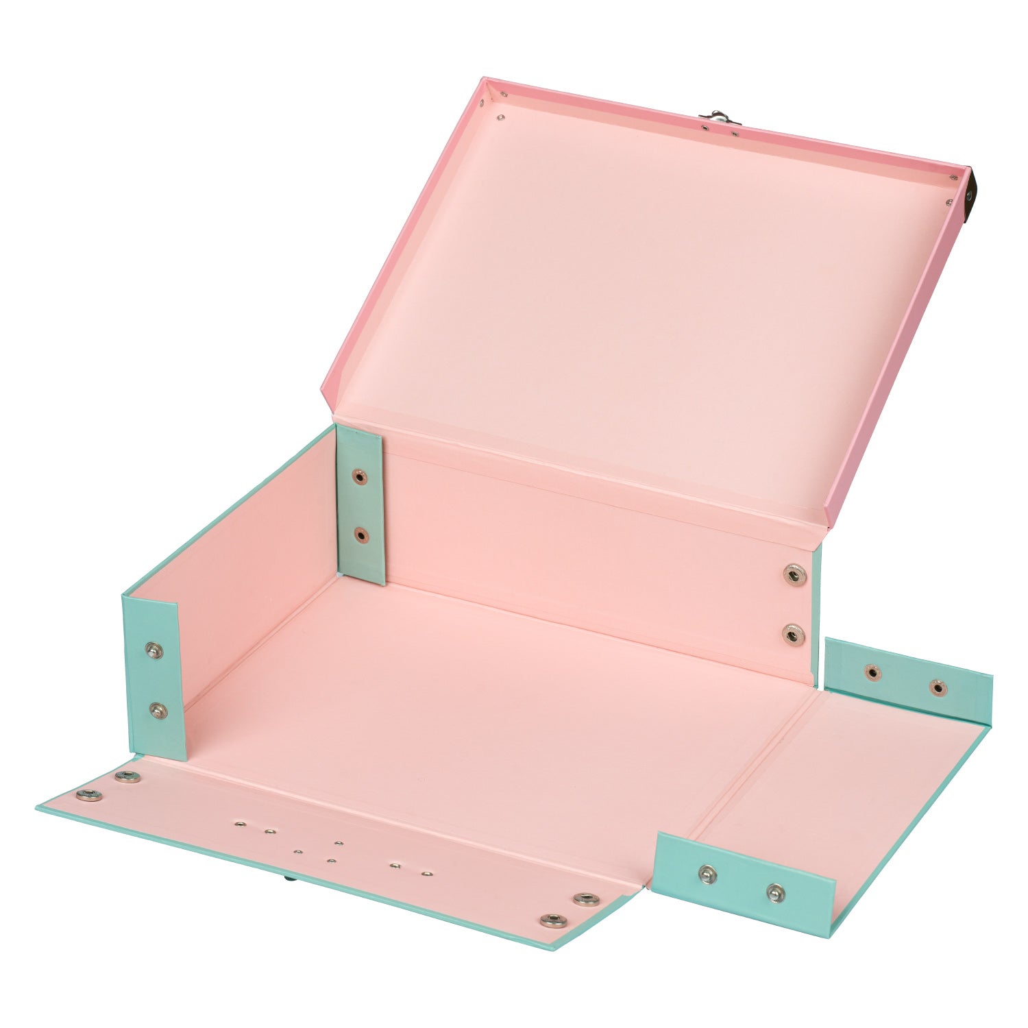 • Skládací kufřík z pevného laminovaného papíru s okovanými rohy.