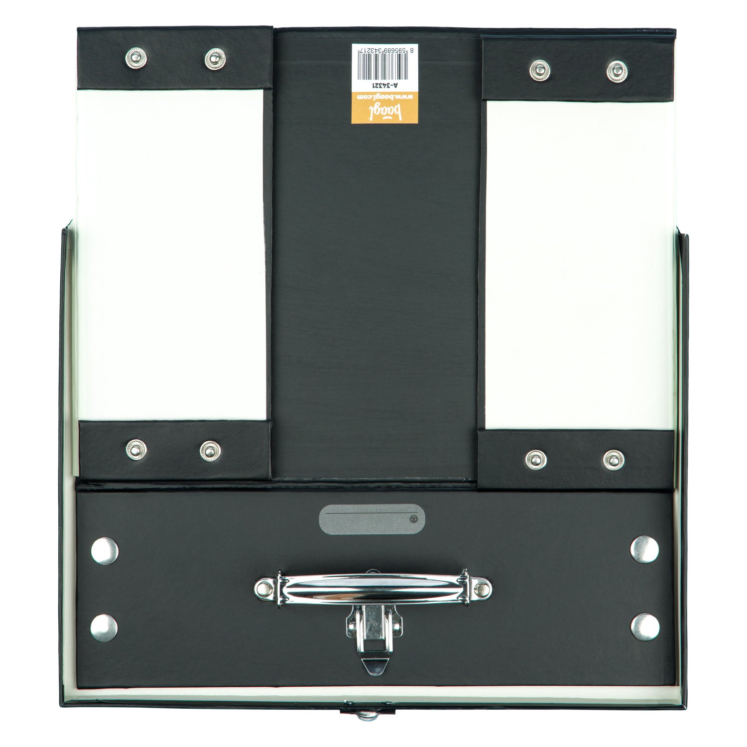• Skládací kufřík z pevného laminovaného papíru s okovanými rohy.