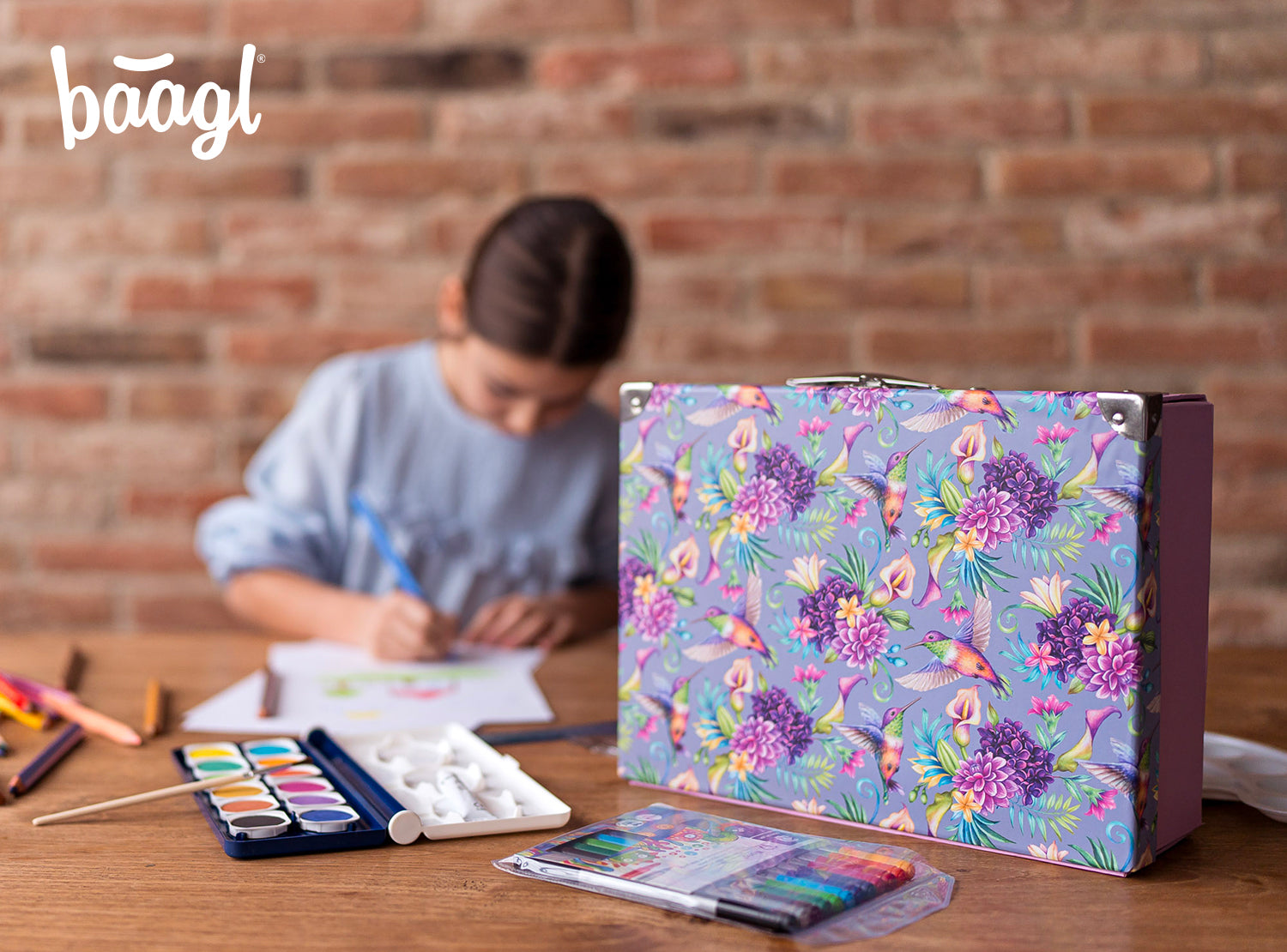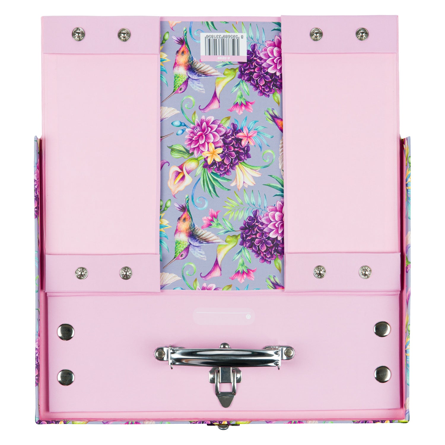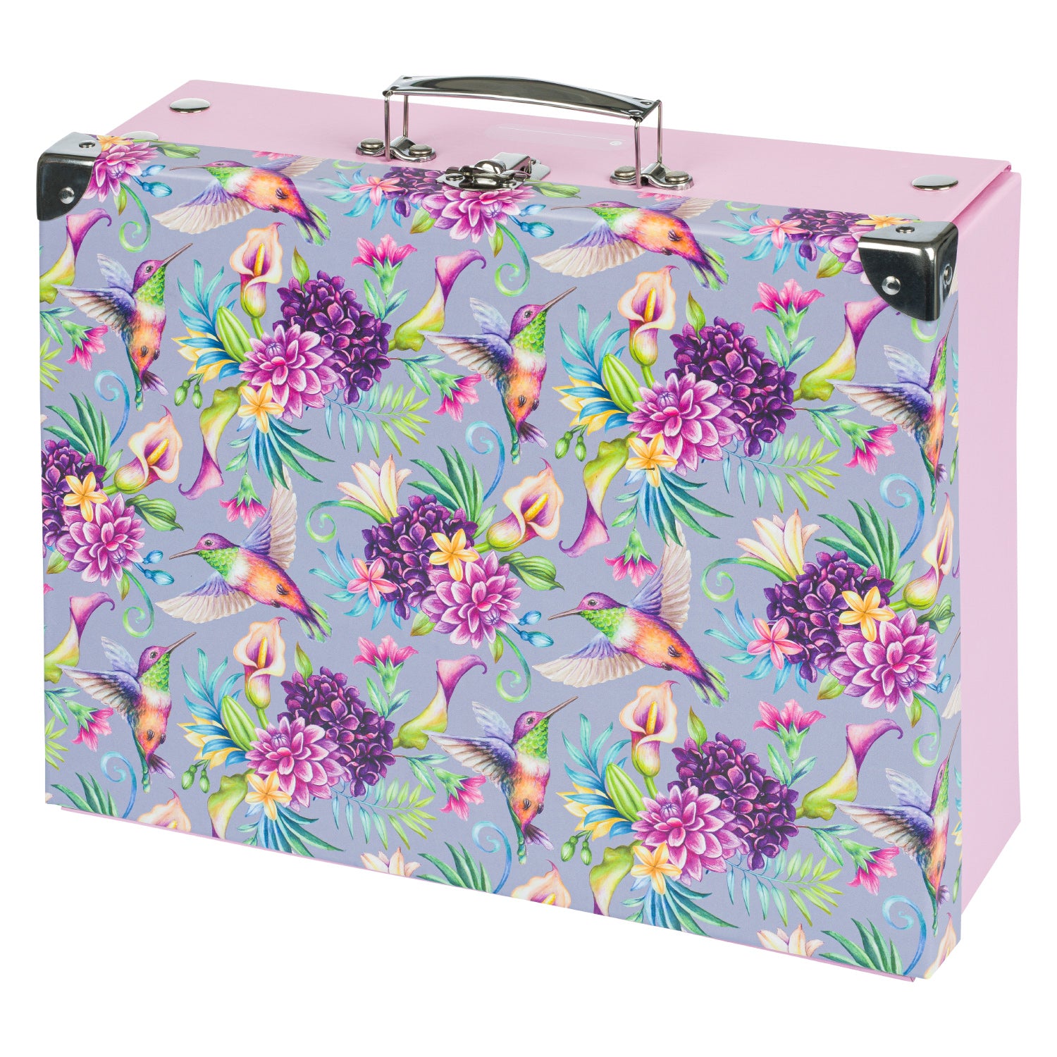 Papírový znovu rozkládací kufřík s barevným motivem kolibříků bezpečně uschová a ochrání výtvarné potřeby. Jednoduchý systém skládání pomocí patentků.