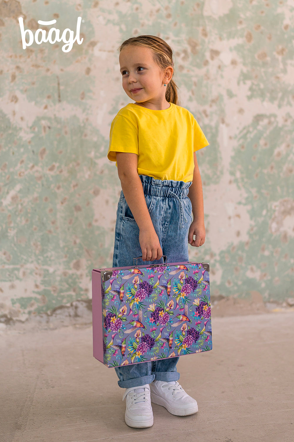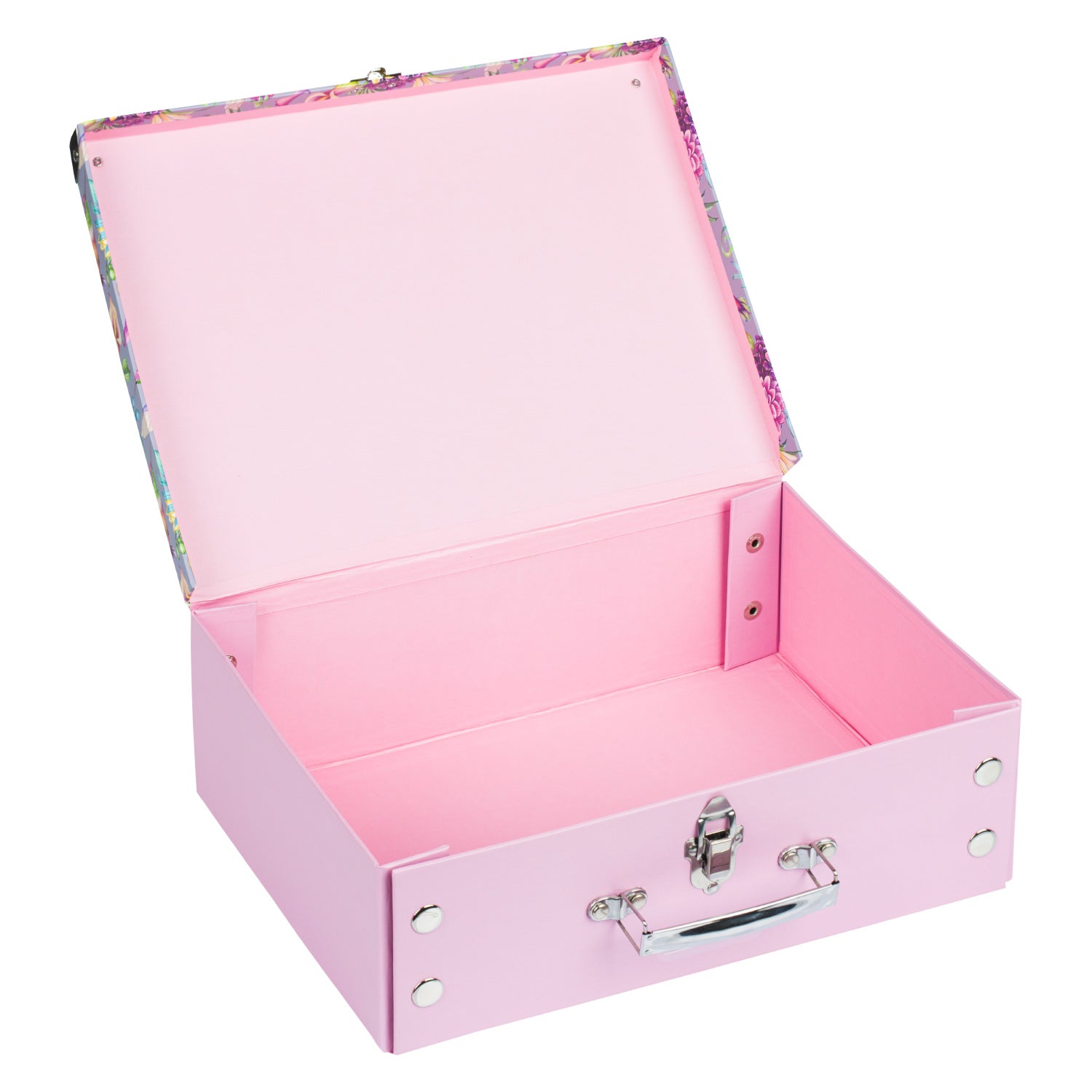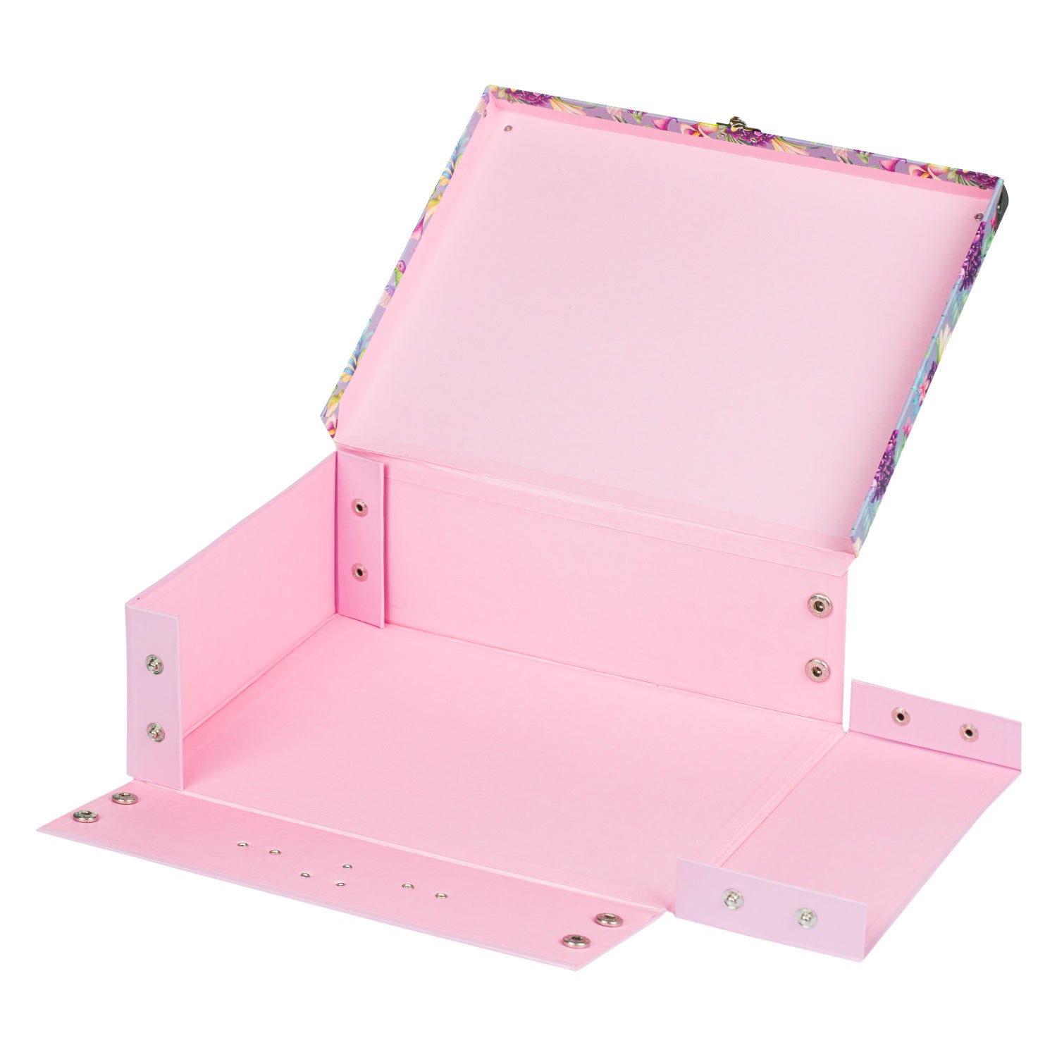 Papírový znovu rozkládací kufřík s barevným motivem kolibříků bezpečně uschová a ochrání výtvarné potřeby. Jednoduchý systém skládání pomocí patentků.