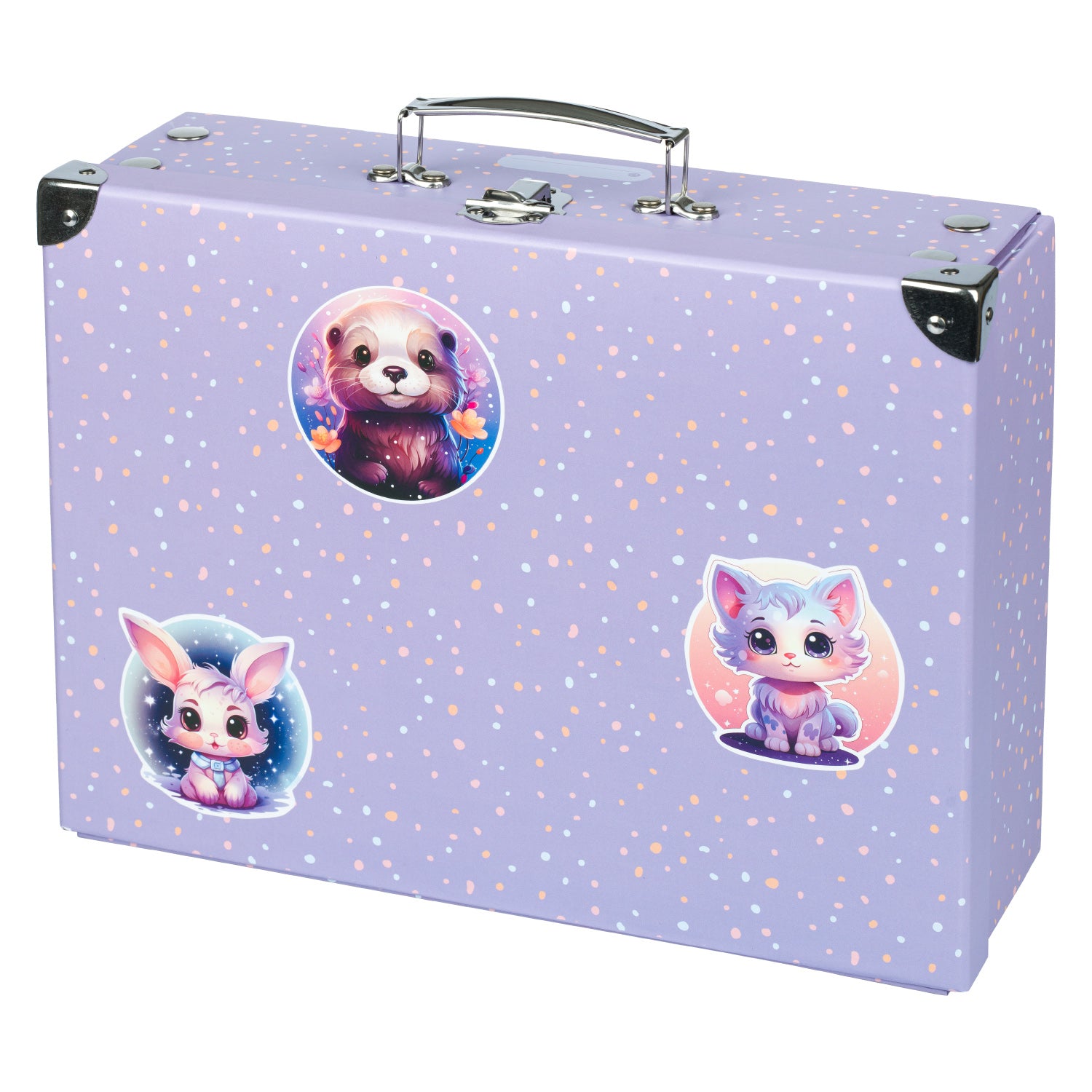 • Skládací kufřík z pevného laminovaného papíru s okovanými rohy.