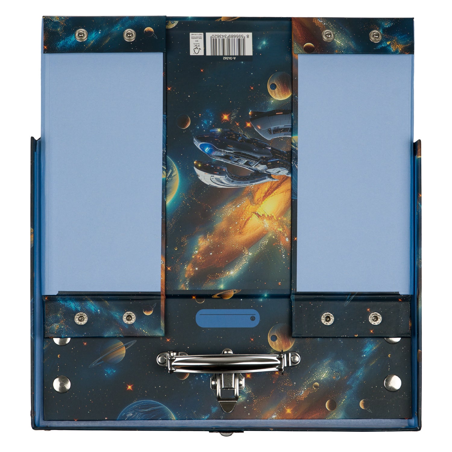 Praktický skládací kufřík s kováním a fascinujícím vesmírným motivem je ideální na uložení výtvarných potřeb, hraček či drobností.