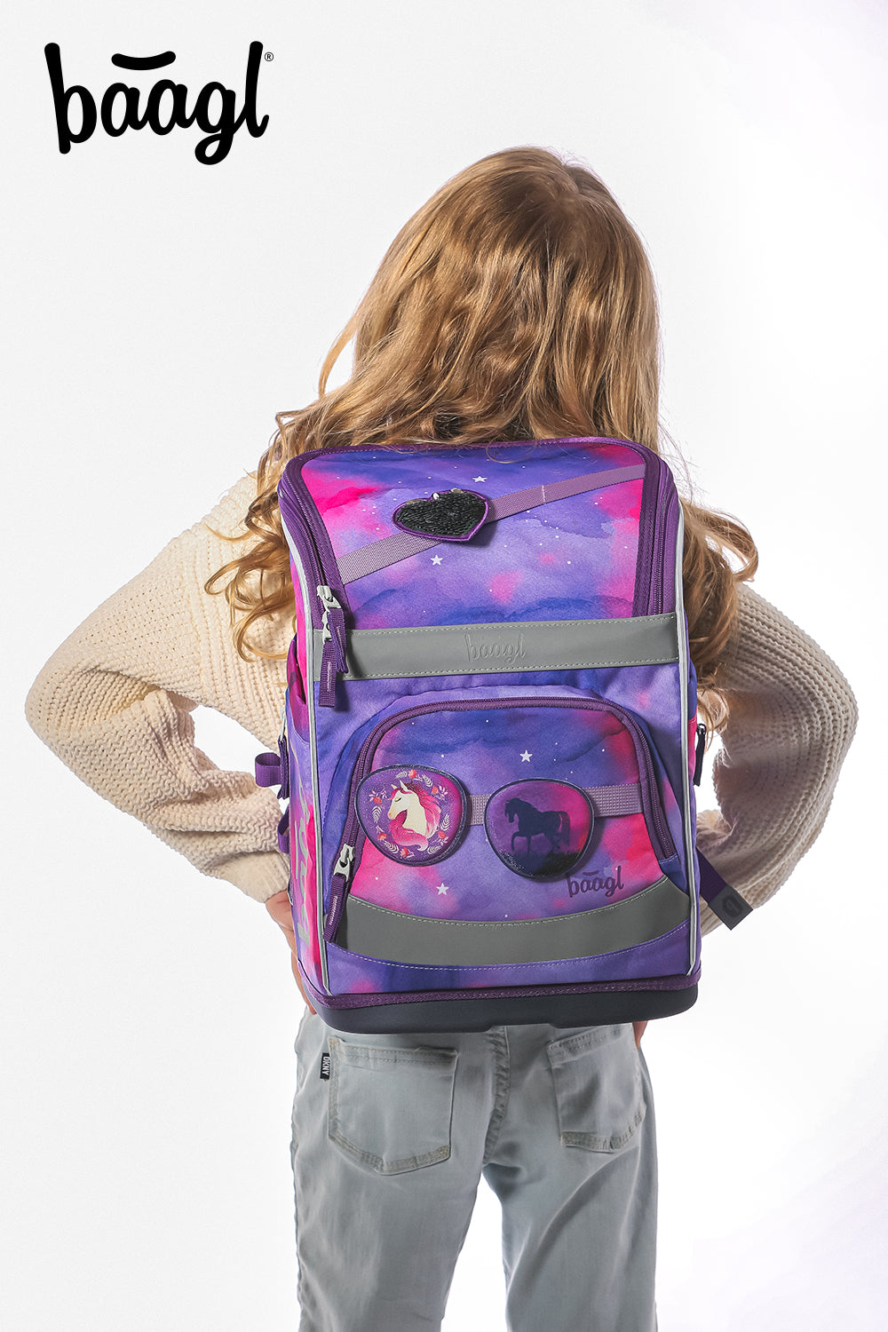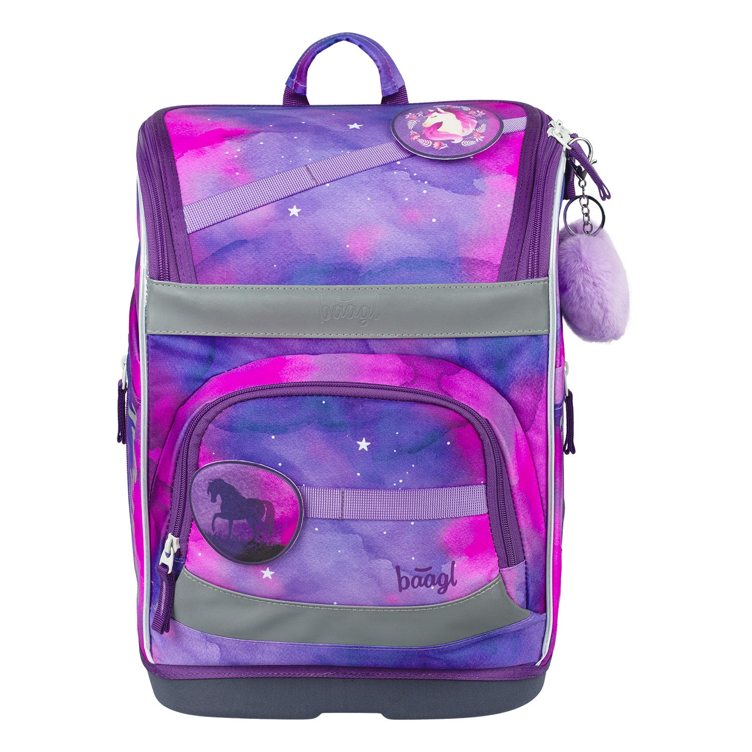 Fialová ergonomická školní aktovka Zippy Plus s motivem koně a odnímatelnými odznáčky, které umožňují měnit její vzhled podle nálady, potěší každou milovnici koní.