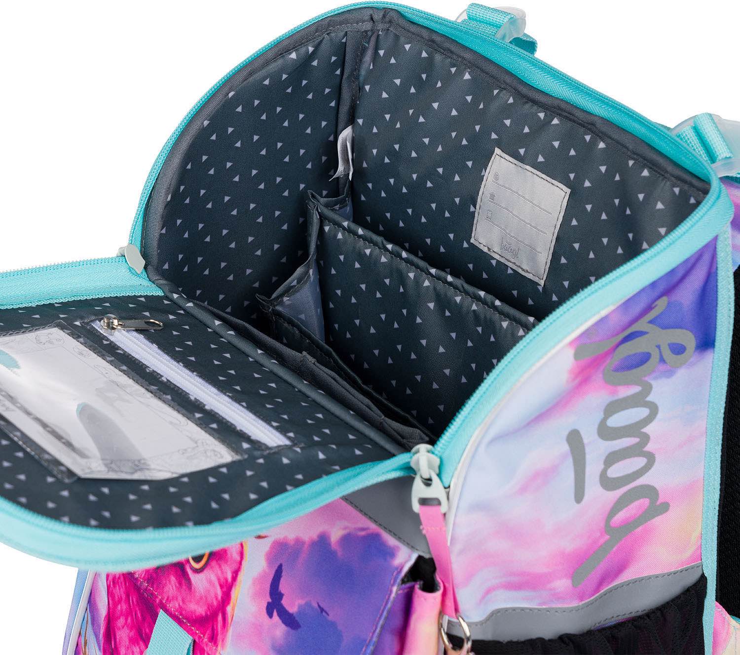 • Uvnitř aktovky je průhledná kapsa s rozvrhem a vnitřní organizér umožňující rovnoměrné rozložení hmotnosti, doplněný gumičkou pro fixaci.