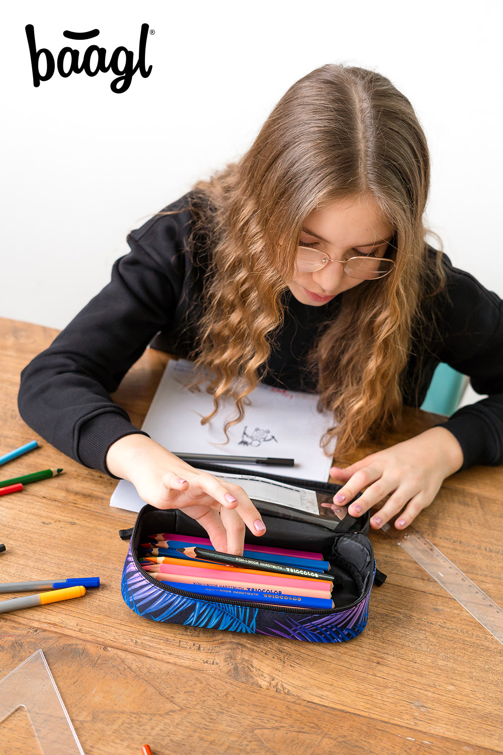 Prostorný penál s motivem listů a logem BAAGL. Součástí penálu je hlavní kapsa a výklopná kapsička s přepážkou a gumičkami na tužky a jiné psací potřeby.
