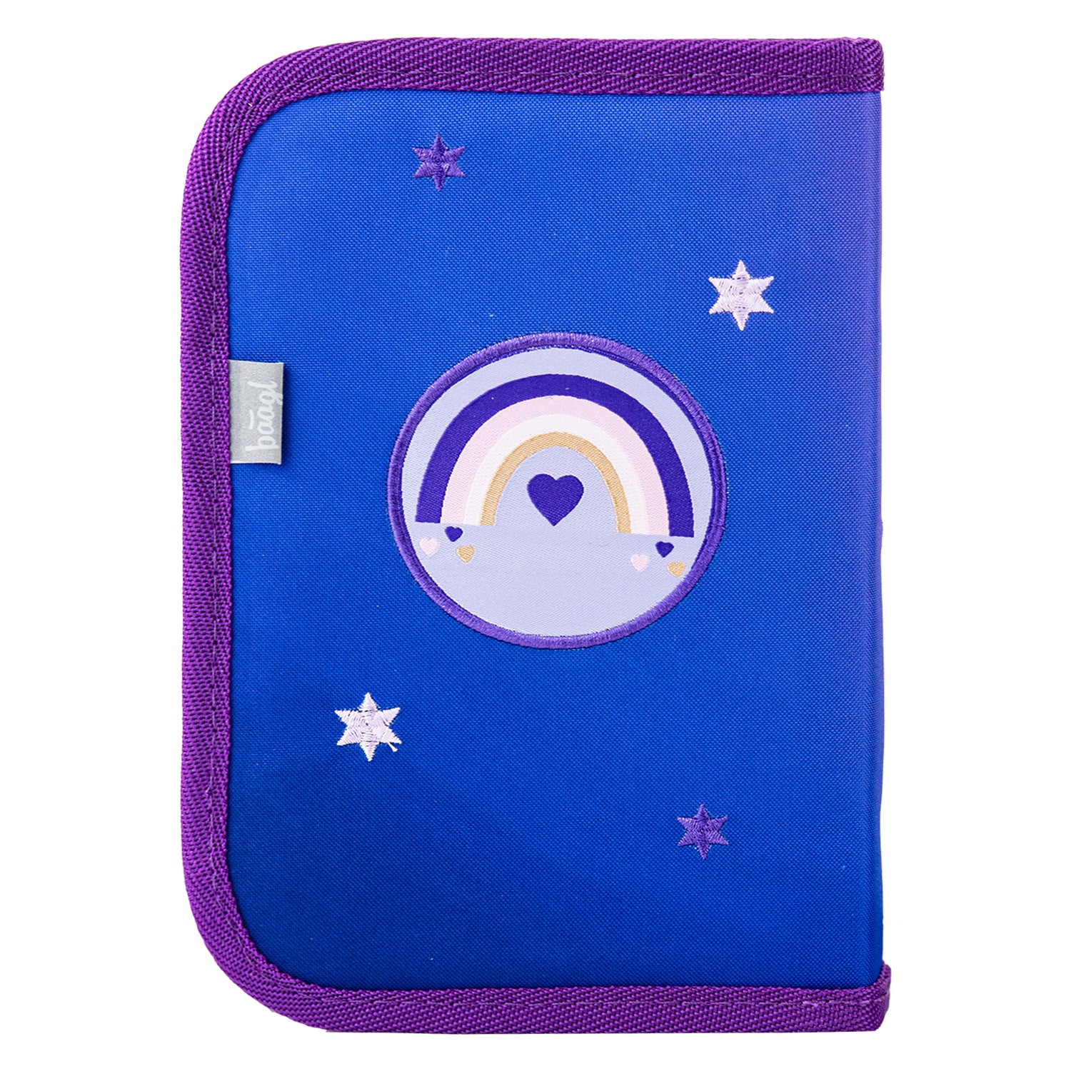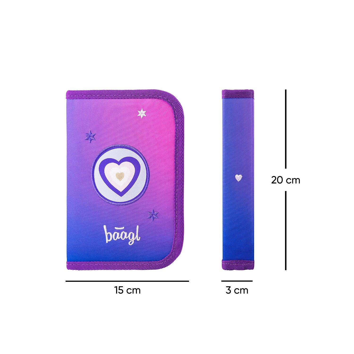 Klasický jednopatrový penál s motivem srdíčka a praktickou kapsičkou na drobnosti je vyroben z recyklovaného materiálu a díky pevným gumičkám je vhodný i pro uložení trojhranných tužek.