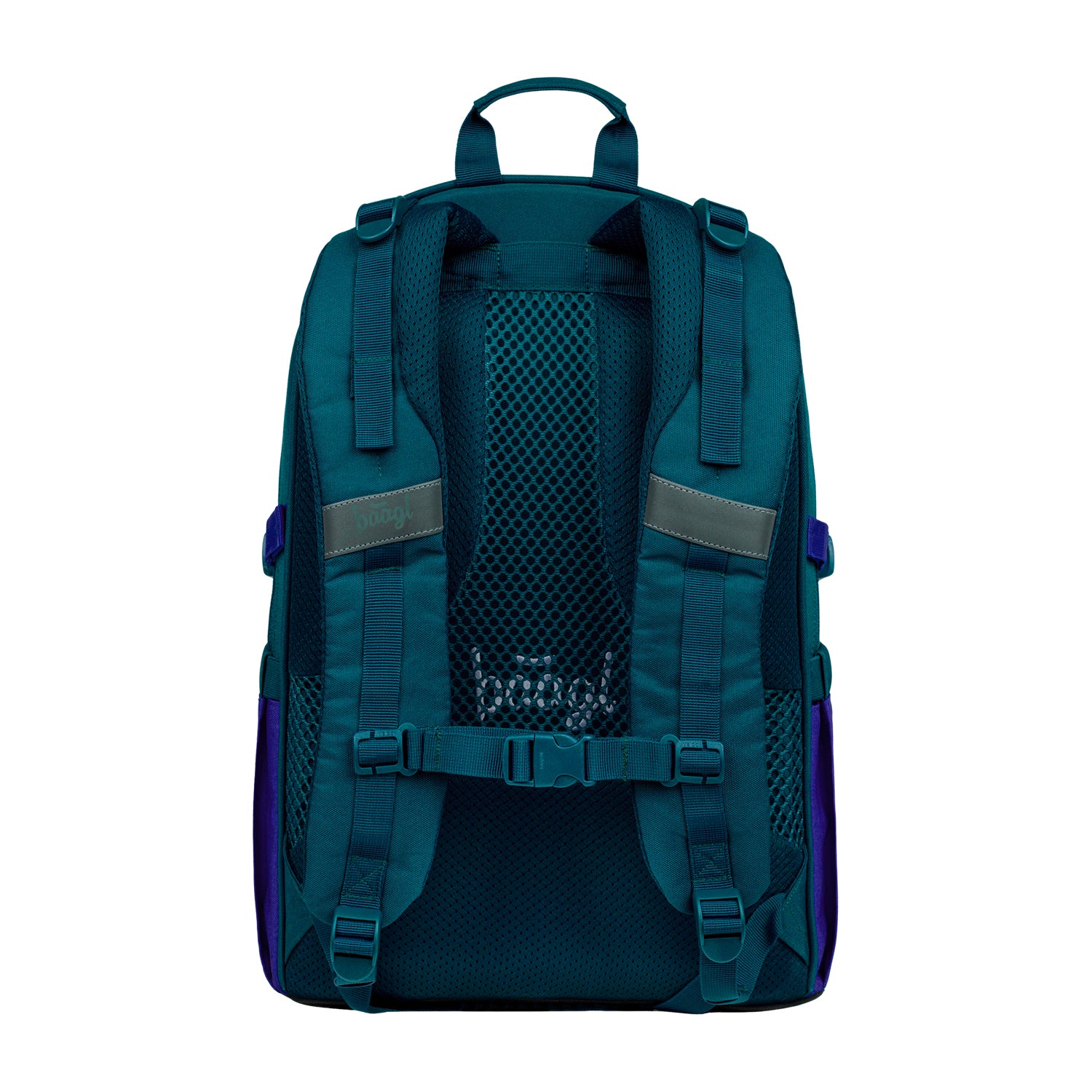 Třídílný set zahrnující ergonomický batoh Core vhodný pro žáky od 3. třídy základní školy, prostorný penál typu etue a sáček na obuv či přezůvky z pevného recyklovaného materiálu.