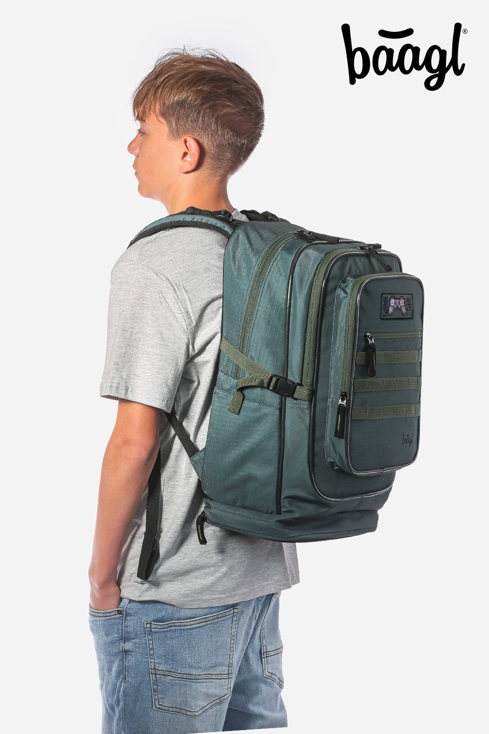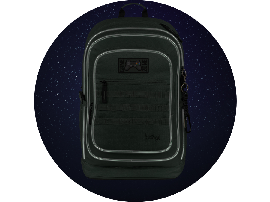 Třídílný set složený z ergonomického batohu Cubic Grove s motivem počítačové hry, školního penálu etue a sáčku na obuv z recyklovaného materiálu je ideální volbou pro školáky od 3. třídy ZŠ.