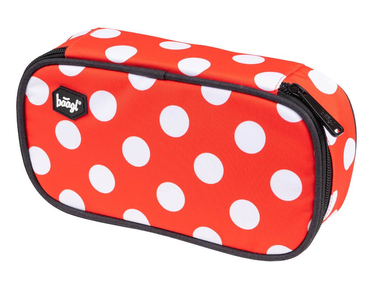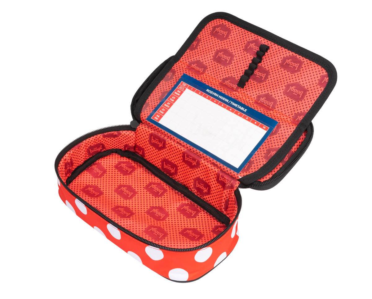 • Pevný penál na zip s dvojitou výklopnou chlopní a s potiskem puntíků.