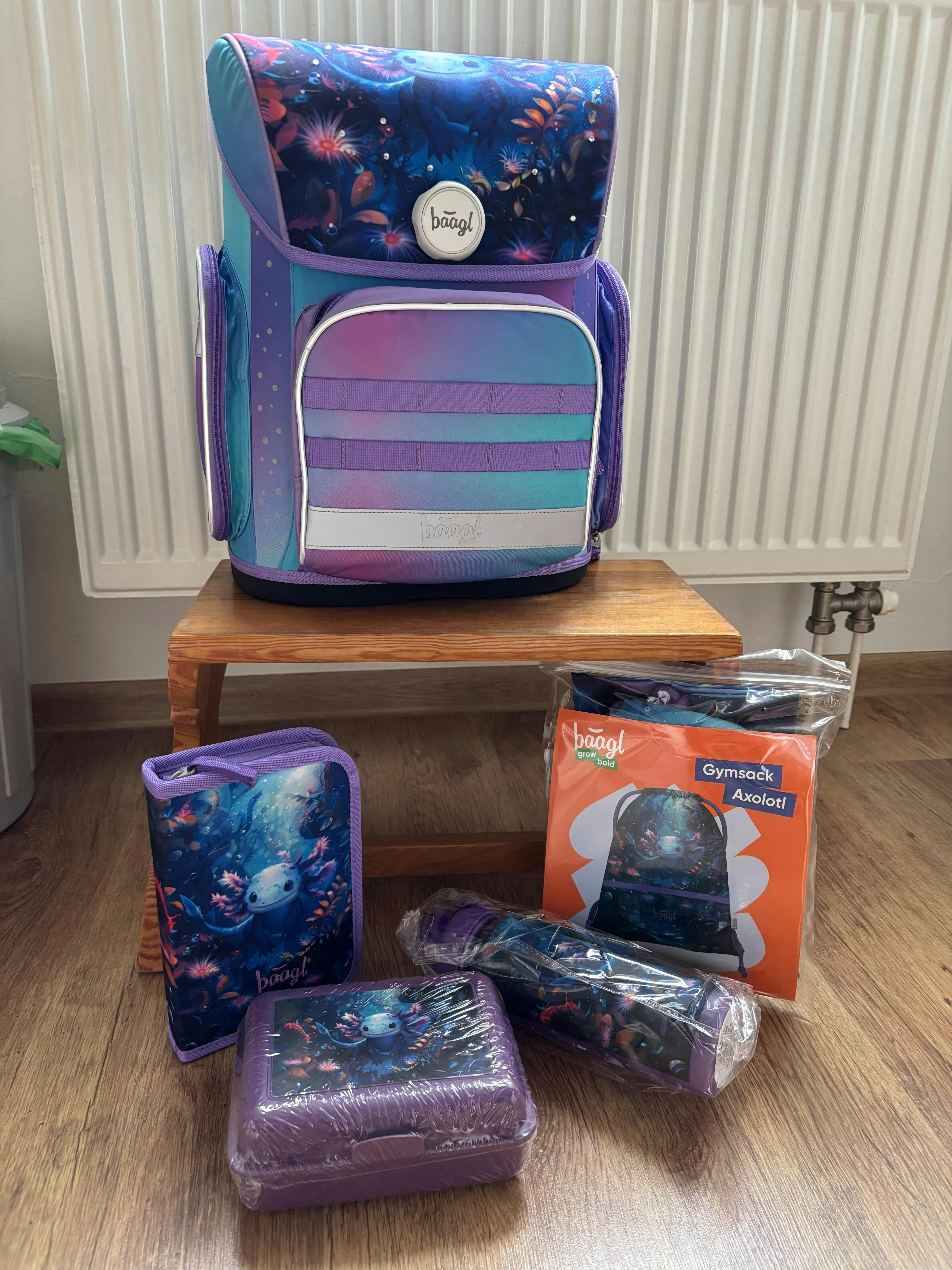 Tříset složený ze školní aktovky ERGO s vyměnitelnými patchemi, klasického penálu a sáčku na obuv s motivem roztomilého axolotla.