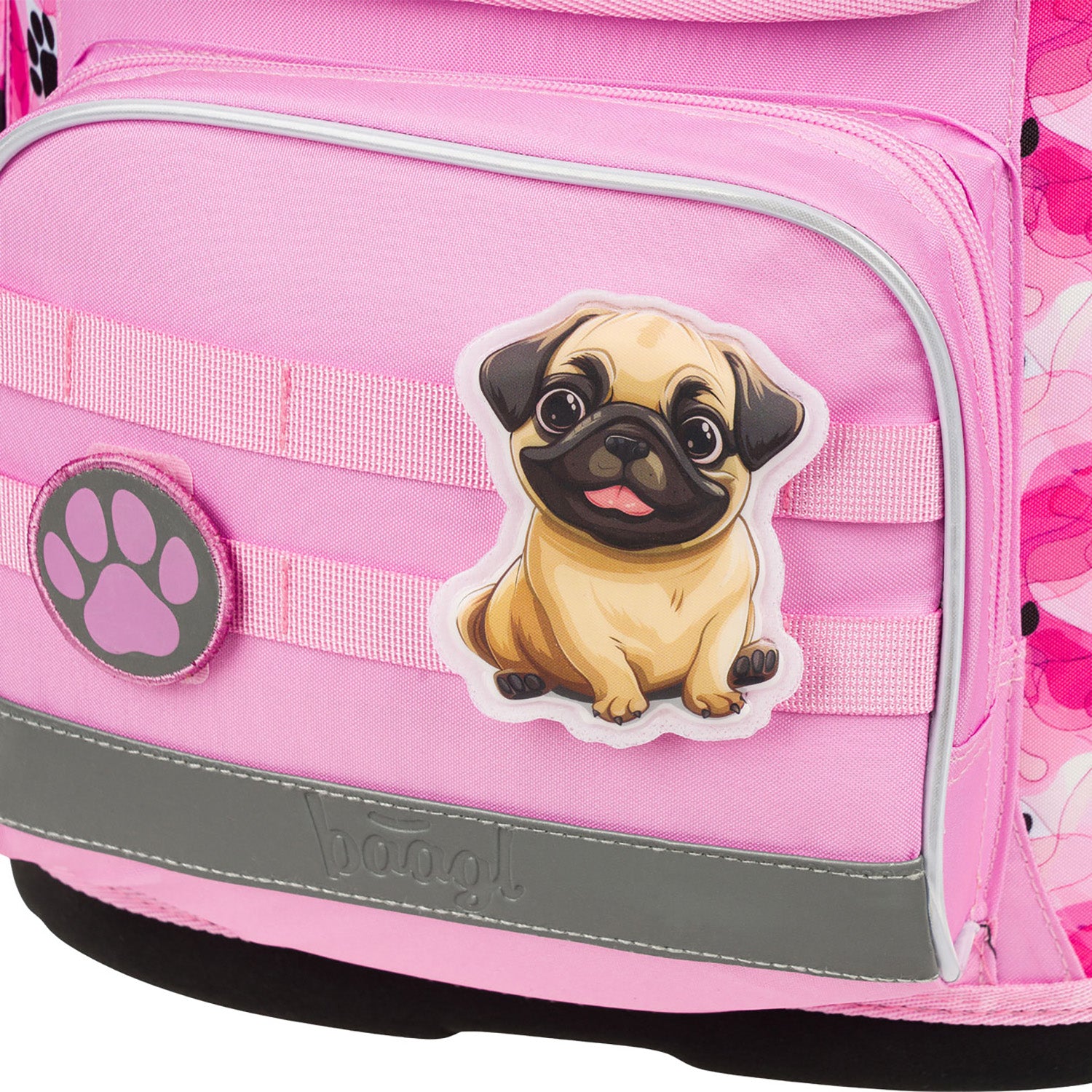 Tříset složený ze školní aktovky ERGO s intuitivním zapínáním FIDLOCK, klasického penálu a sáčku na obuv s motivem roztomilého buldočka.