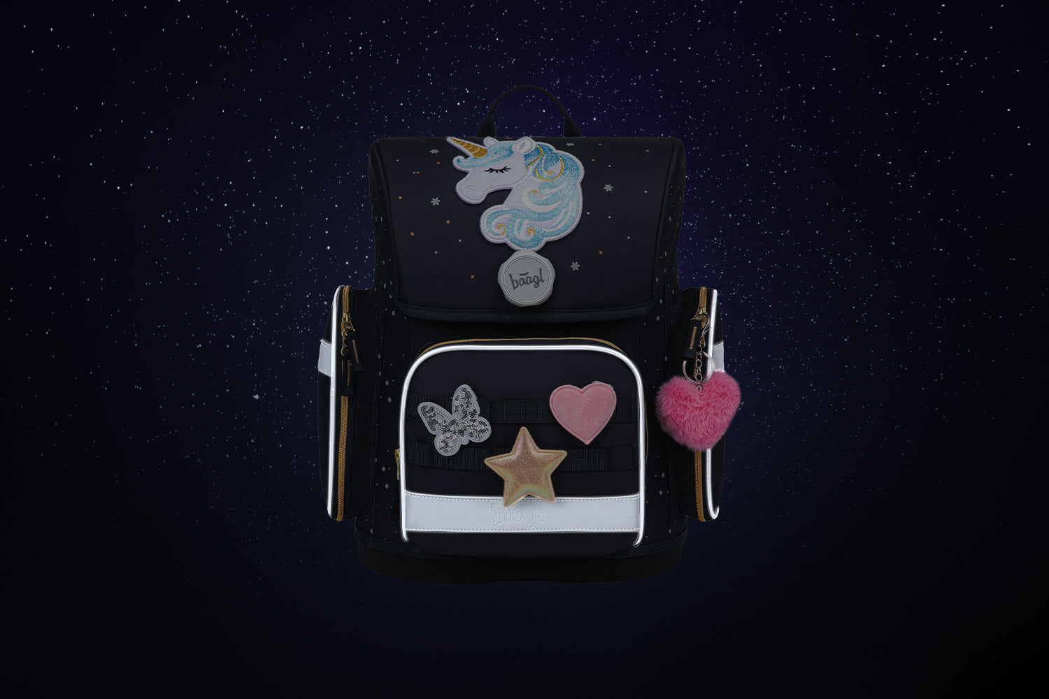 Velký set Ergo Unicorn zahrnuje aktovku Ergo s jedinečným designem jednorožce na indigově modré obloze, vyměnitelnými odznáčky a zlatými detaily. Součástí výhodného setu je také klasický penál, praktická zástěrka na výtvarnou výchovu, sáček na obuv i peněženka.
