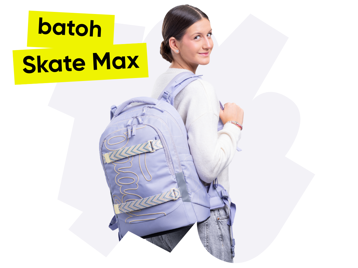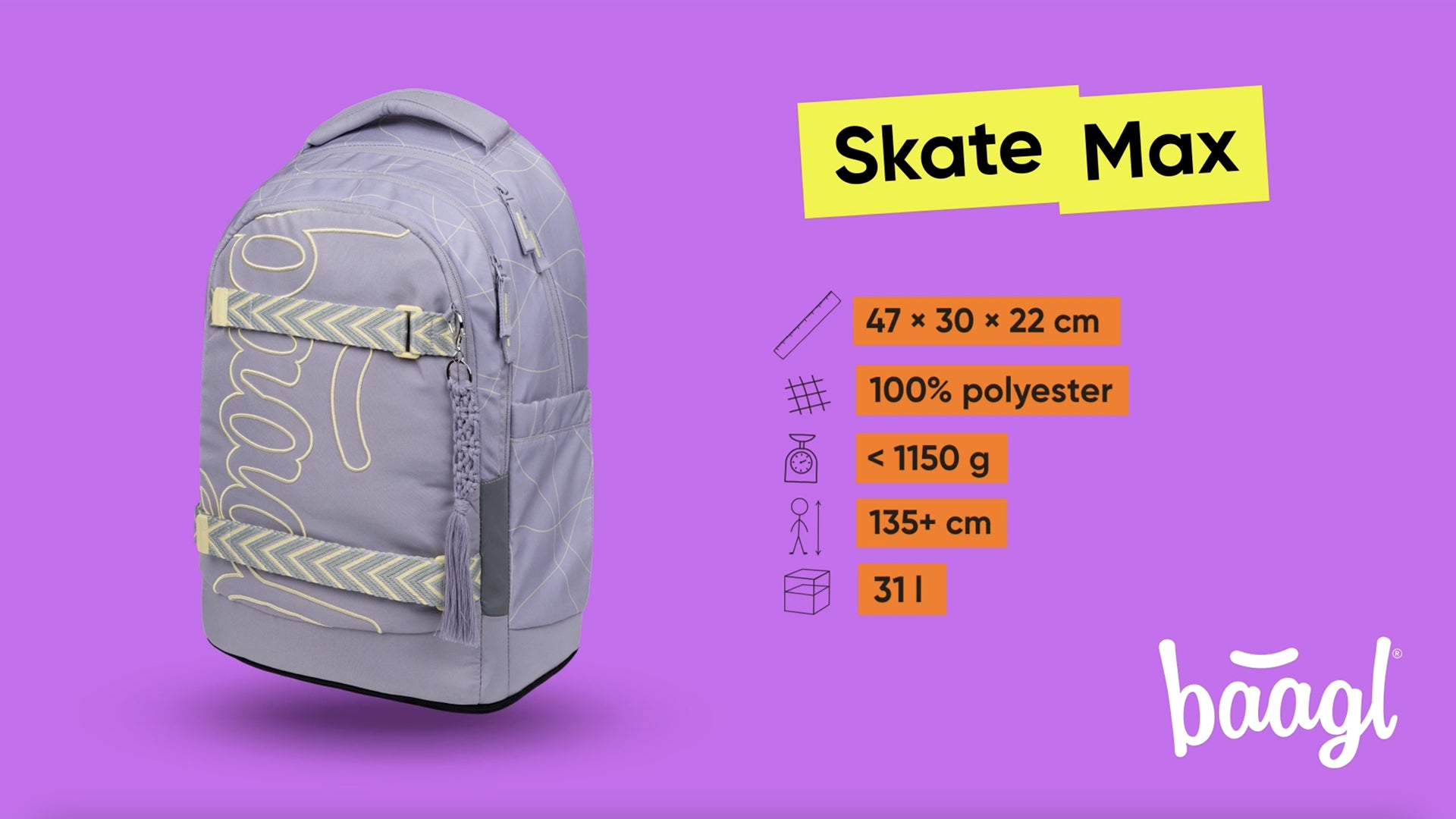 • Kompaktní batoh Skate Max je ideální pro žáky a studenty od 155 do 185 cm, což odpovídá přibližně 3. třídě ZŠ a výše.