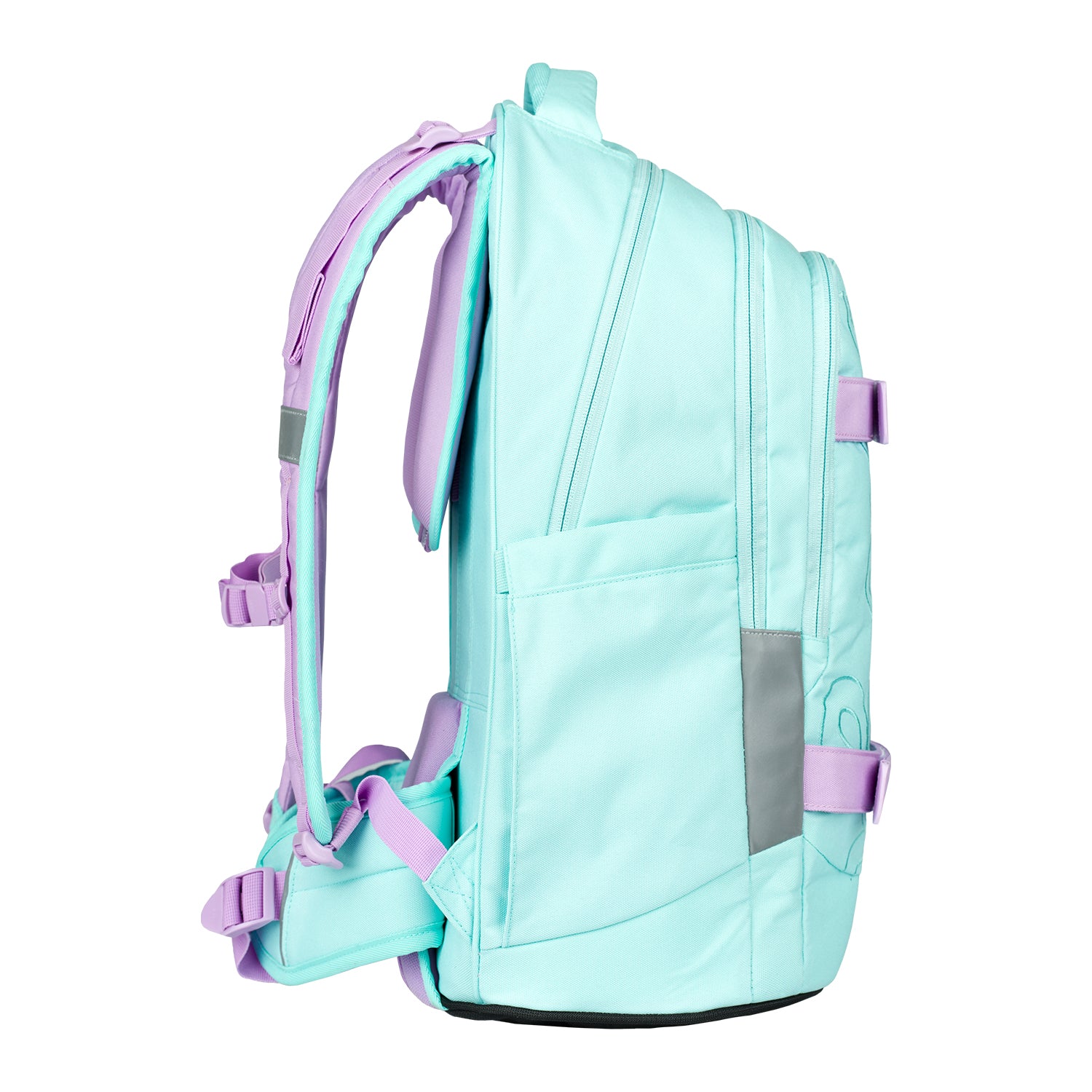 Pětidílný set zahrnující ergonomický batoh Skate Max Sweet s nastavitelným zádovým systémem, skládací sportovní tašku, stylovou ledvinku, penál etue a sáček na obuv v jemných pastelových odstínech fialové a zelené obsahuje vše, co je ve škole třeba.