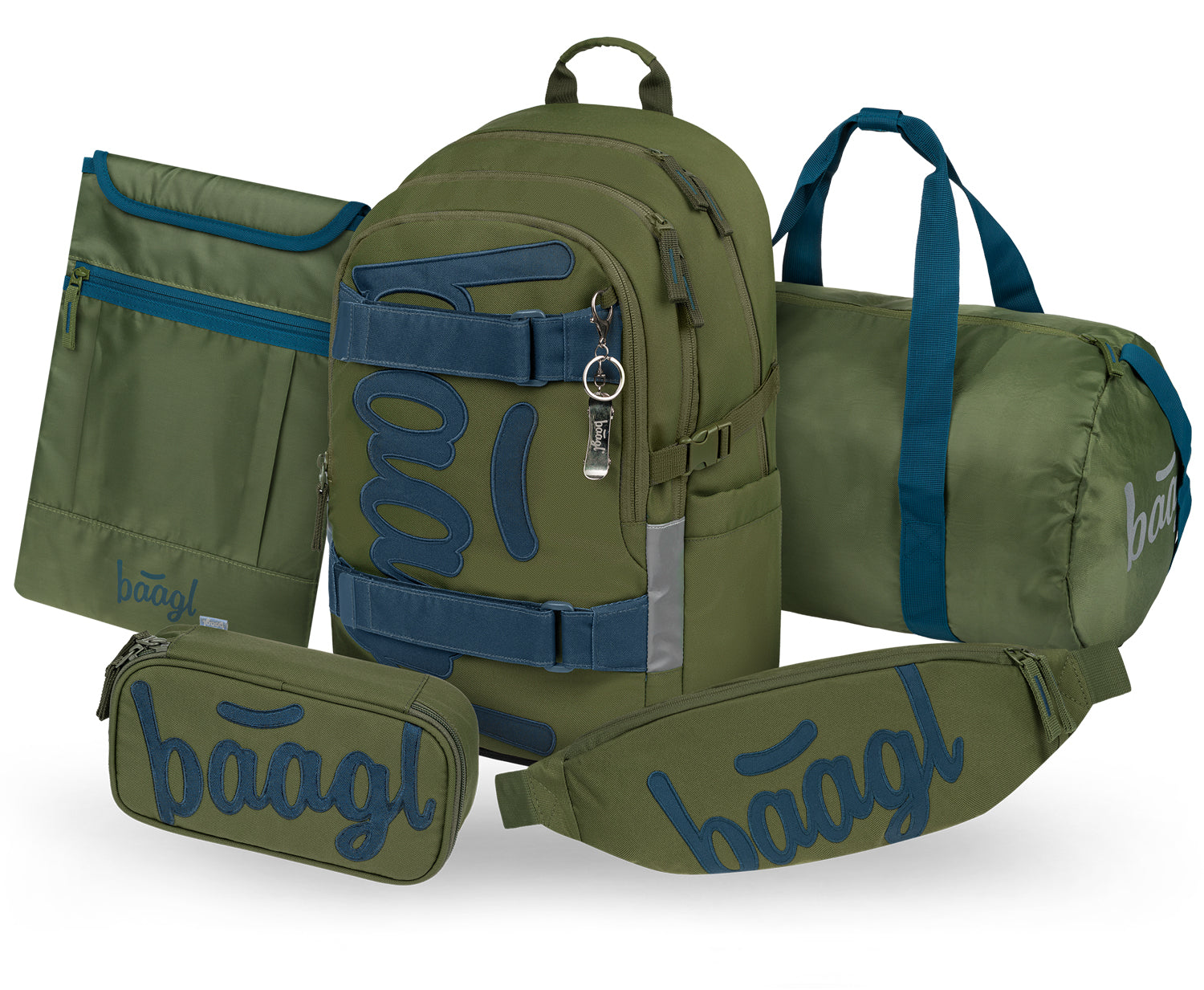 Designový školní set v olivově zeleném odstínu zahrnuje batoh Skate s popruhy pro uchycení skateboardu, penál, skládací sportovní tašku, stylovou ledvinku a praktické pouzdro na notebook. Ideální volba pro žáky od 3. třídy základní školy.