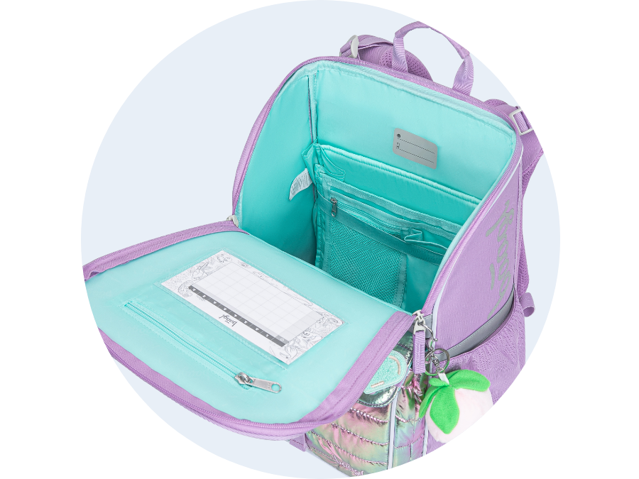 • Uvnitř aktovky je průhledná kapsa na rozvhr a vnitřní organizér umožňující rovnoměrné rozložení hmotnosti, doplněný gumičkou pro fixaci.