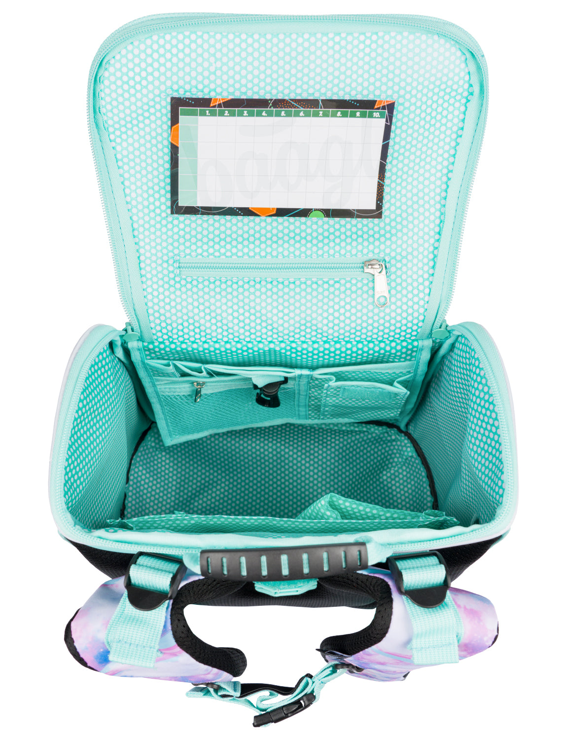 • Uvnitř aktovky je průhledná kapsa s rozvrhem a vnitřní organizér umožňující rovnoměrné rozložení hmotnosti, doplněný gumičkou pro fixaci.