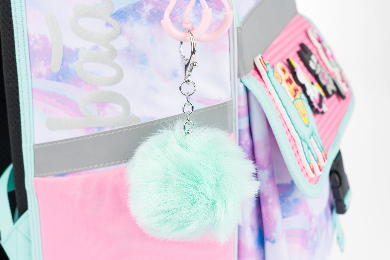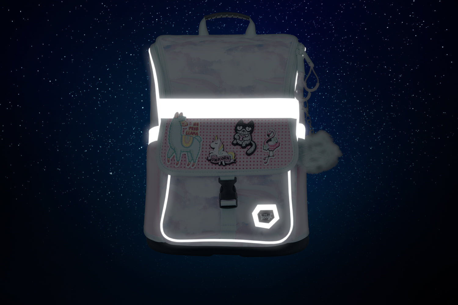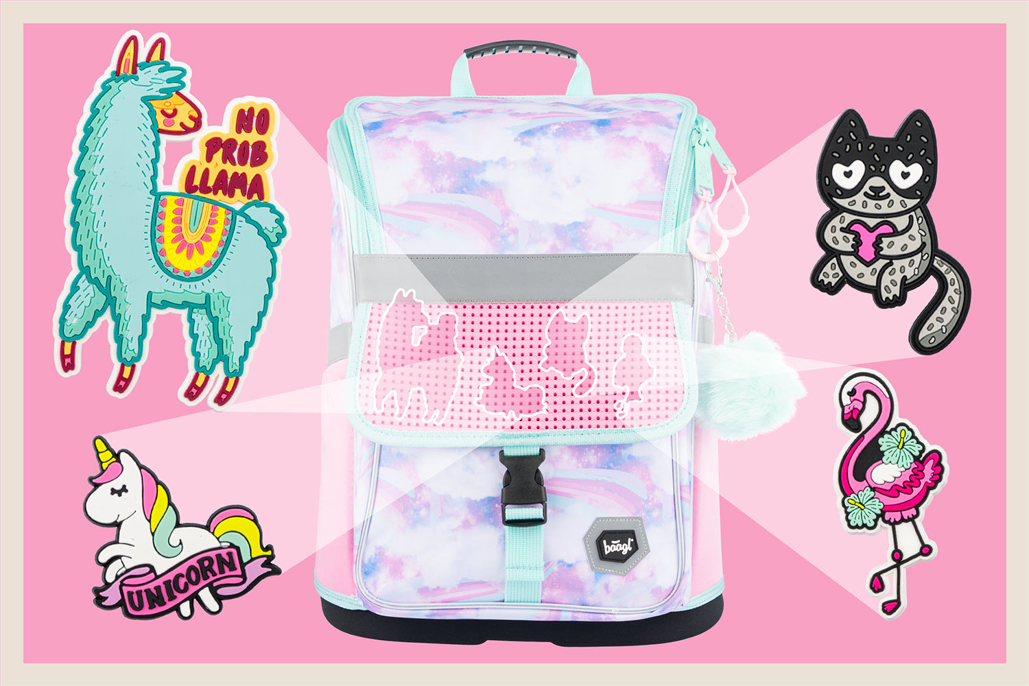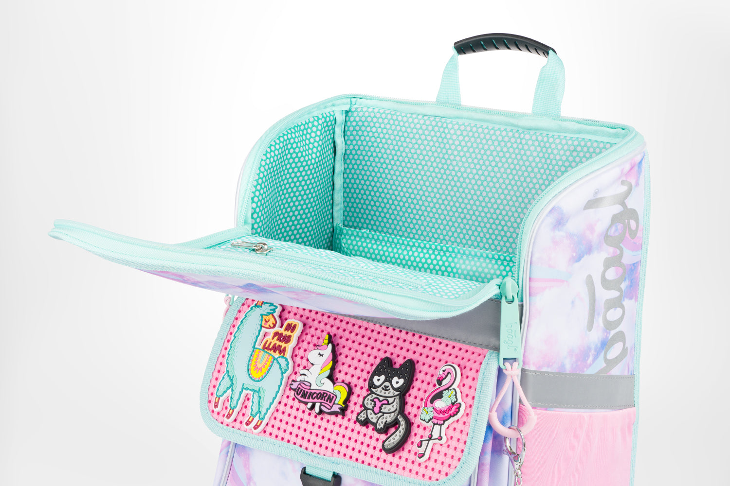• Na klopu přední kapsy můžete libovolně připevňovat odznáčky, které jsou k aktovce jako dárek.